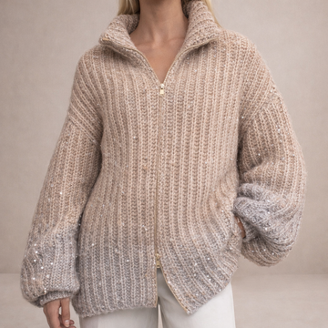Women’s Luxe Zip-Up Knit Sweater with Subtle Sparkle and Cozy Stand Collar This women’s V-neck...