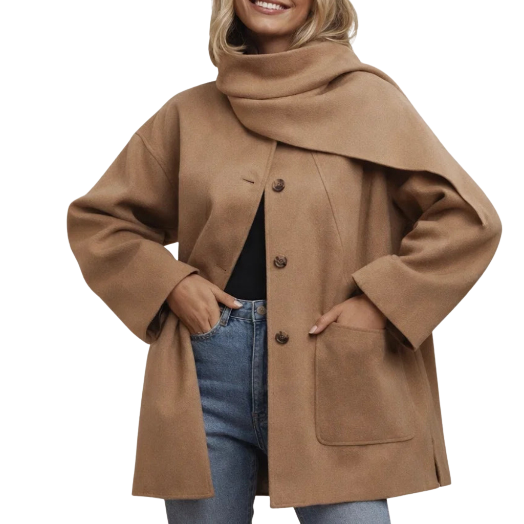 Women’s Camel Button Front Coat with Matching Scarf
