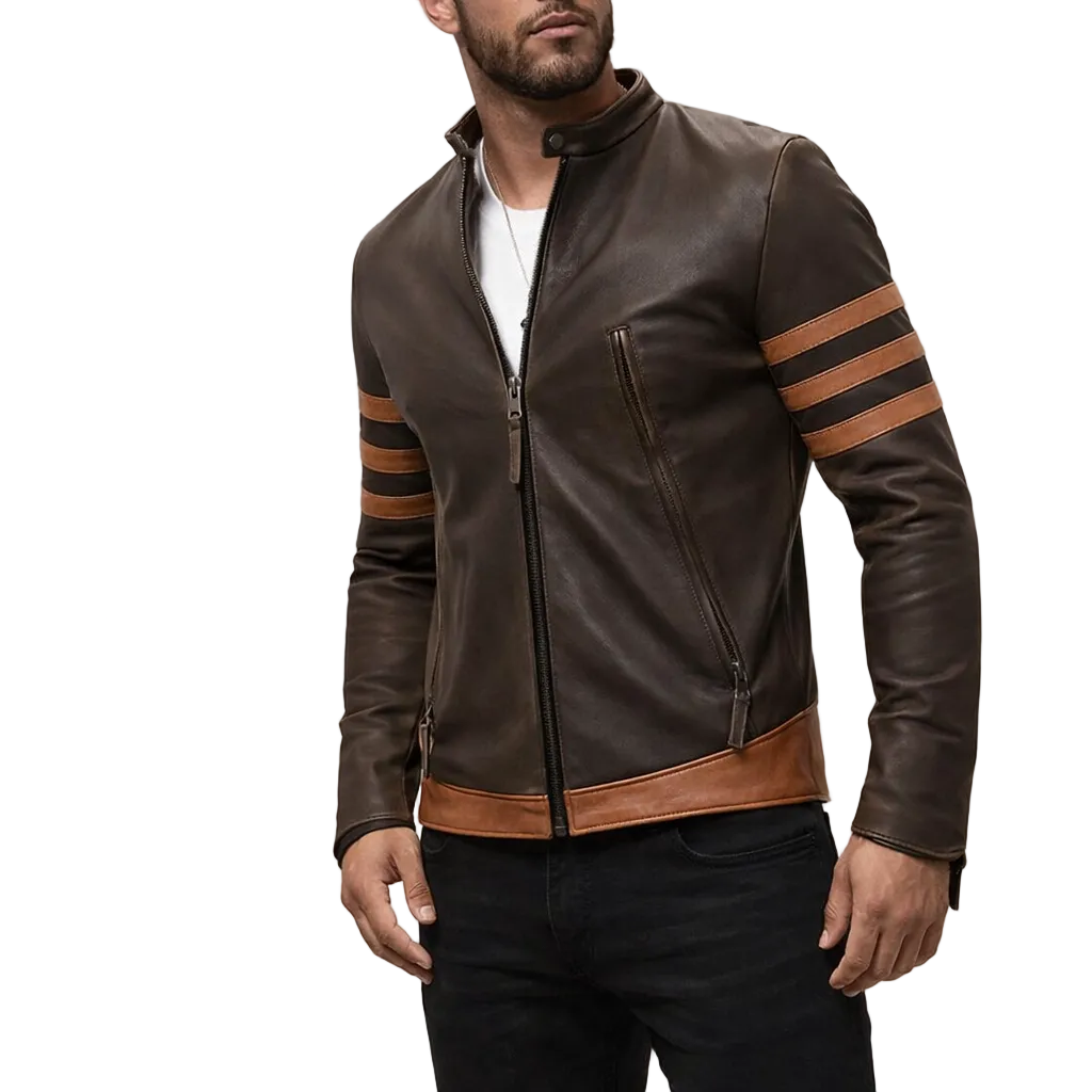 Men’s Biker Jacket with Contrast Stripe Sleeves Brown
