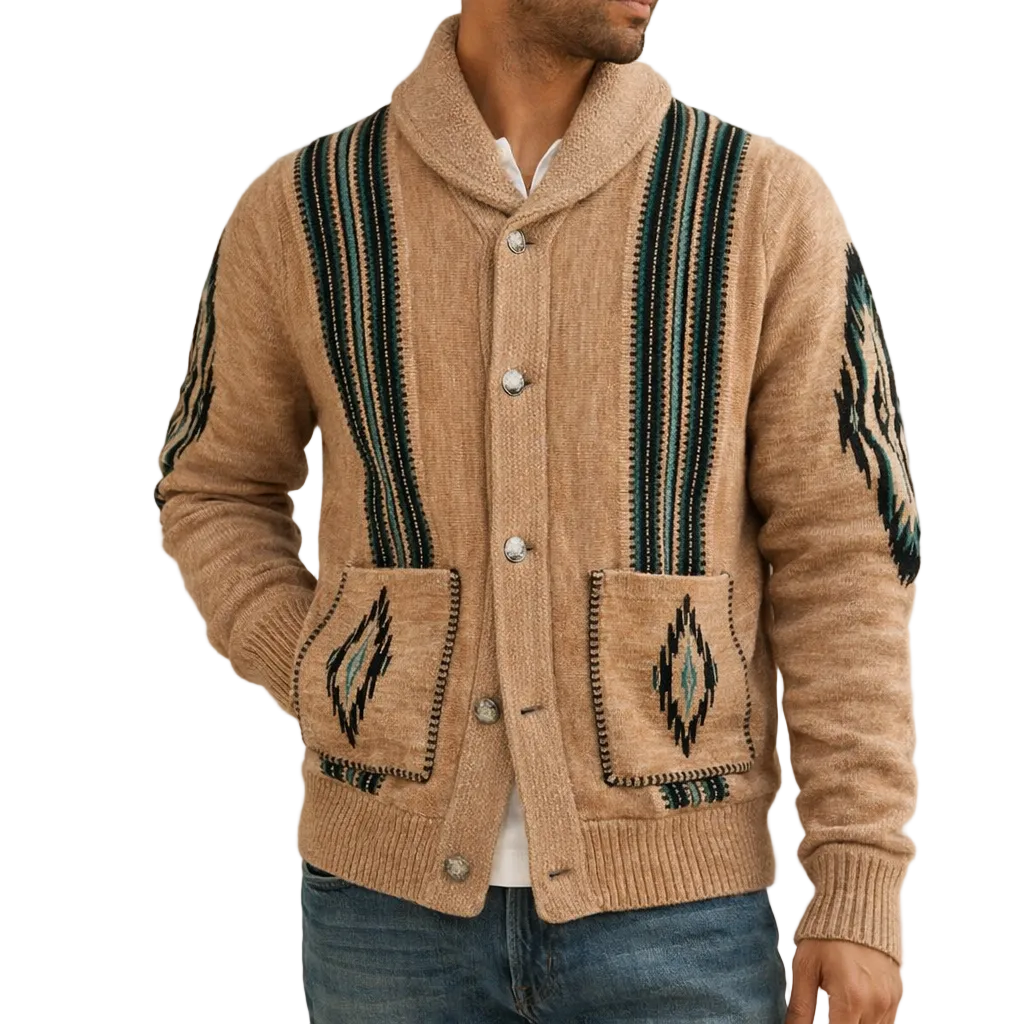 Men’s Shawl Collar Cardigan with Aztec Knit Detail Camel