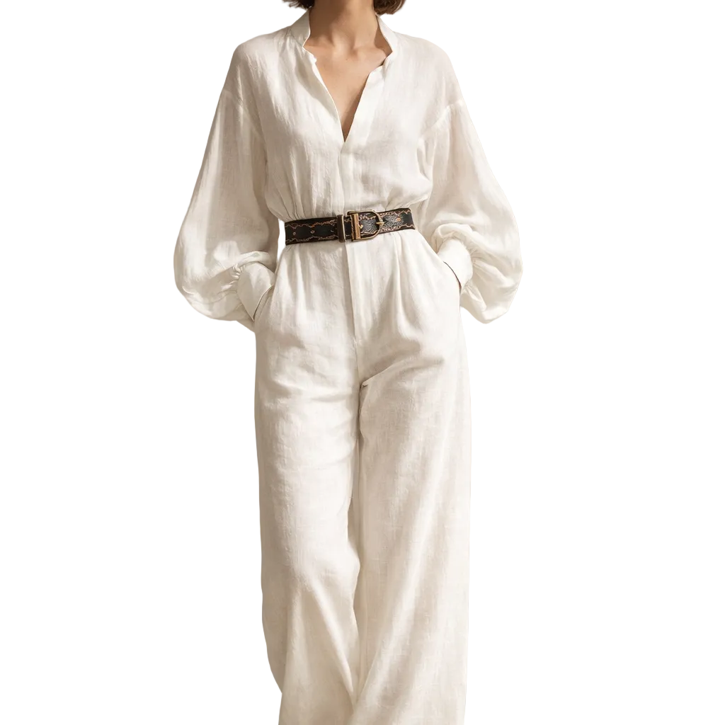 Elegant Linen Belted Jumpsuit with Voluminous Sleeves
