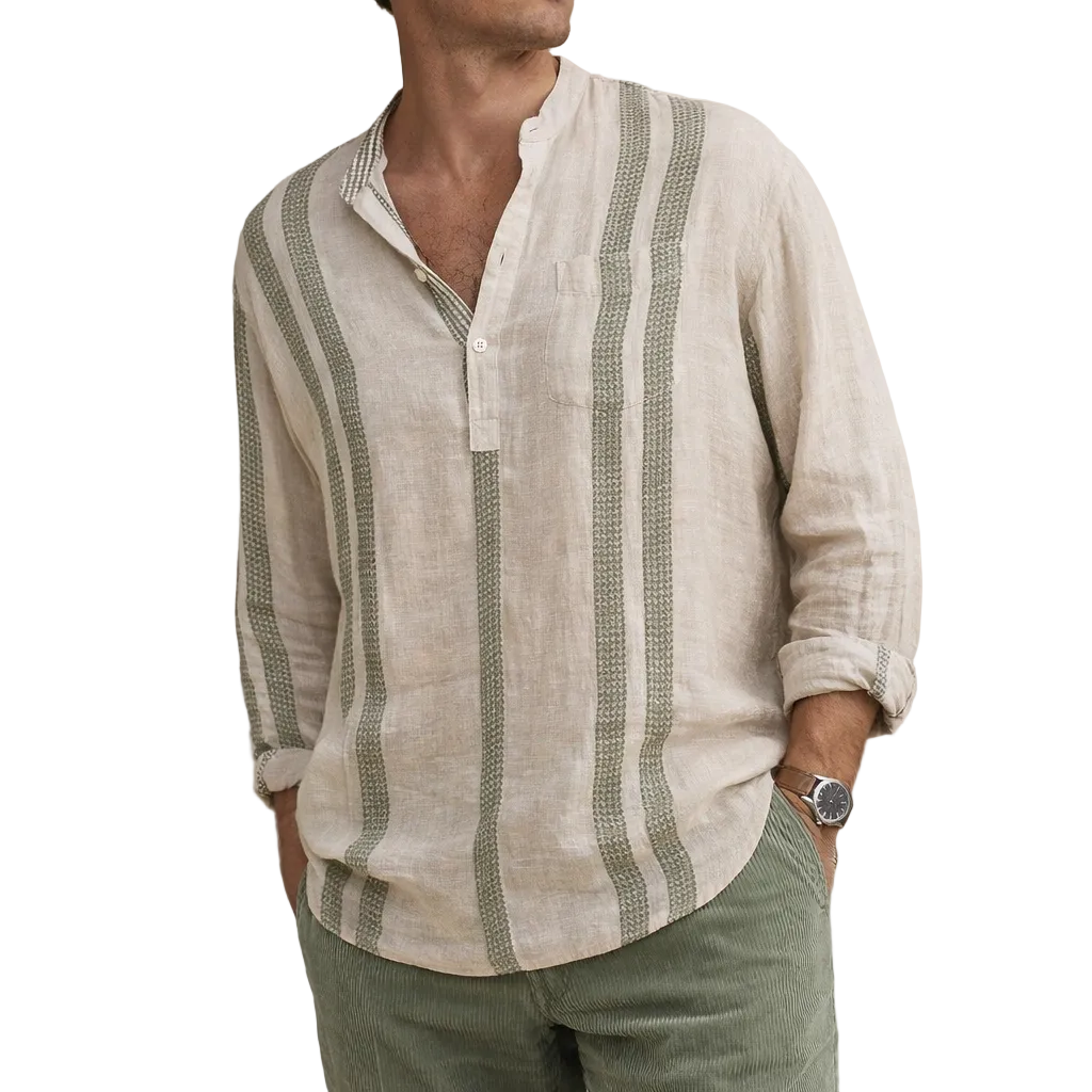Men’s Striped Linen Blend Grandad Collar Shirt