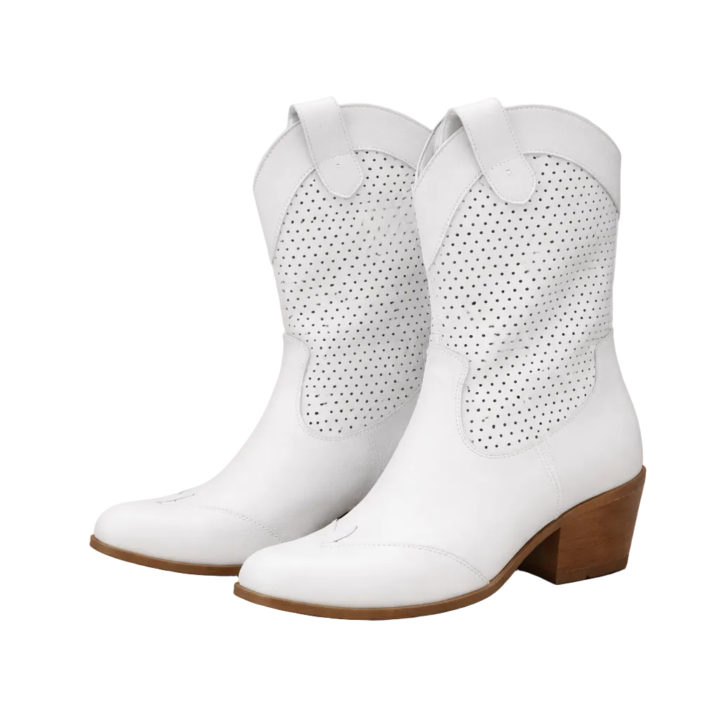 Women’s Perforated Western Ankle Boots with Block Heel and Pull Tabs