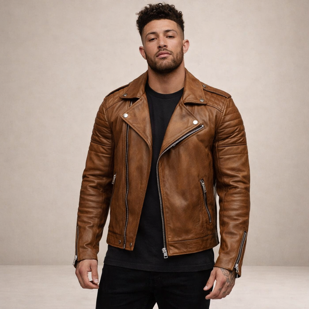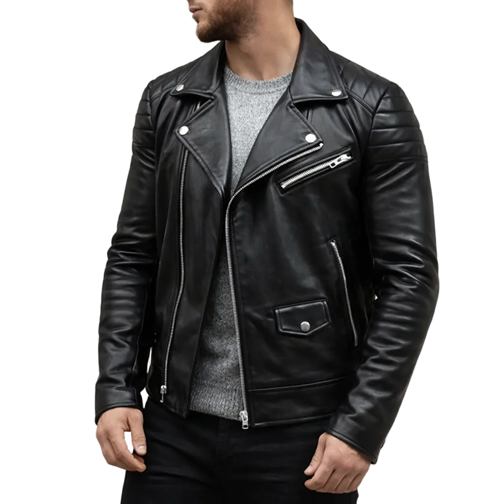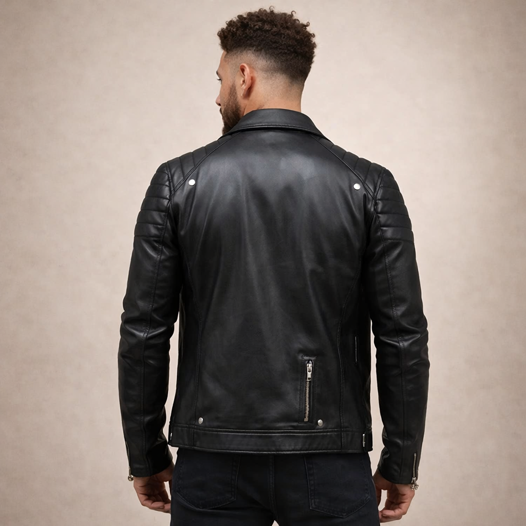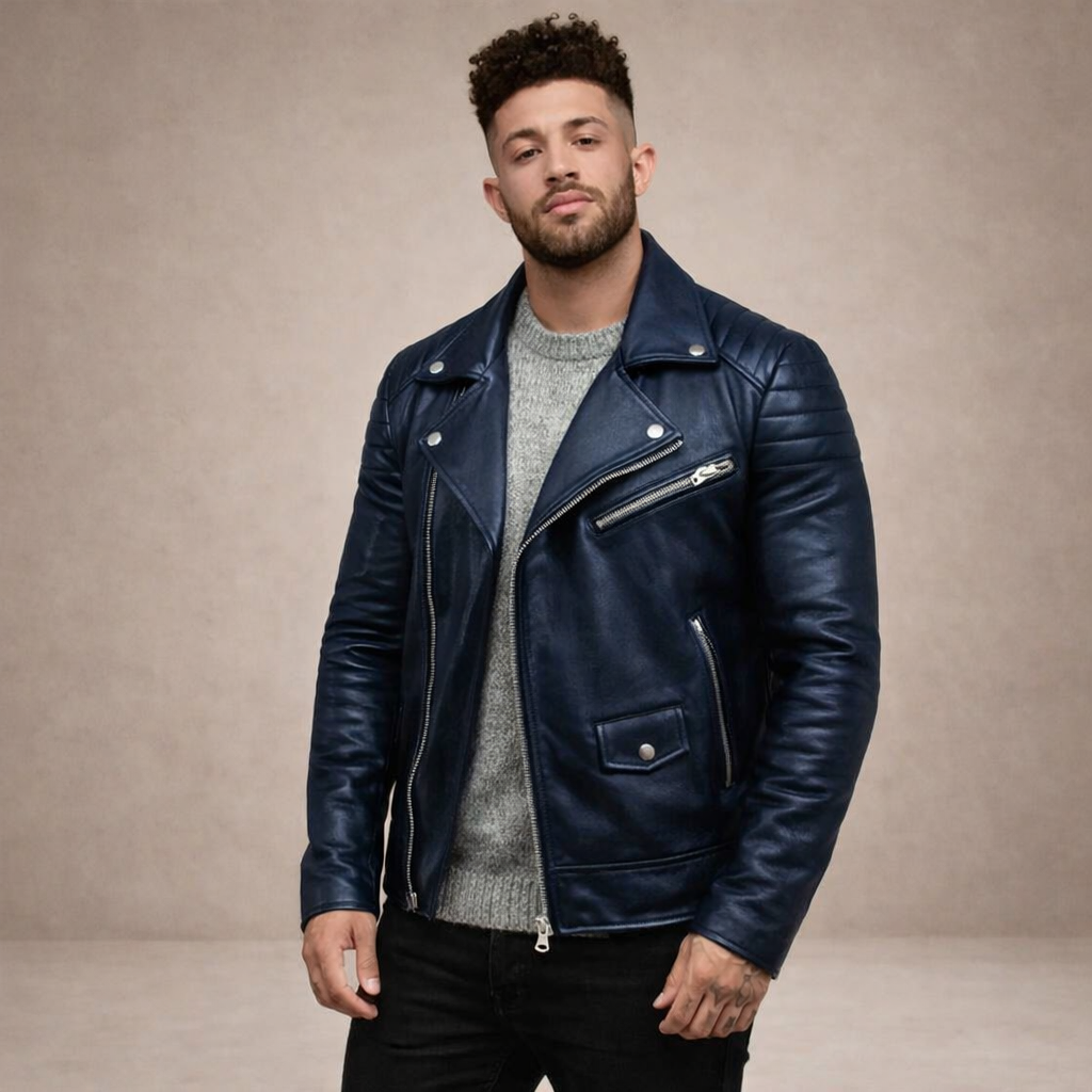Design: Iconic biker silhouette with an asymmetric zip front, wide lapels, and quilted shoulder panels for a strong, masculine edge.