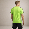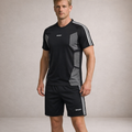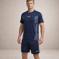 Design: Coordinated two-piece set featuring a short-sleeve athletic T-shirt and matching performance shorts with contrast stripe accents