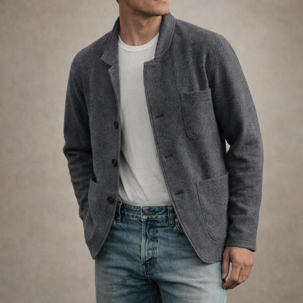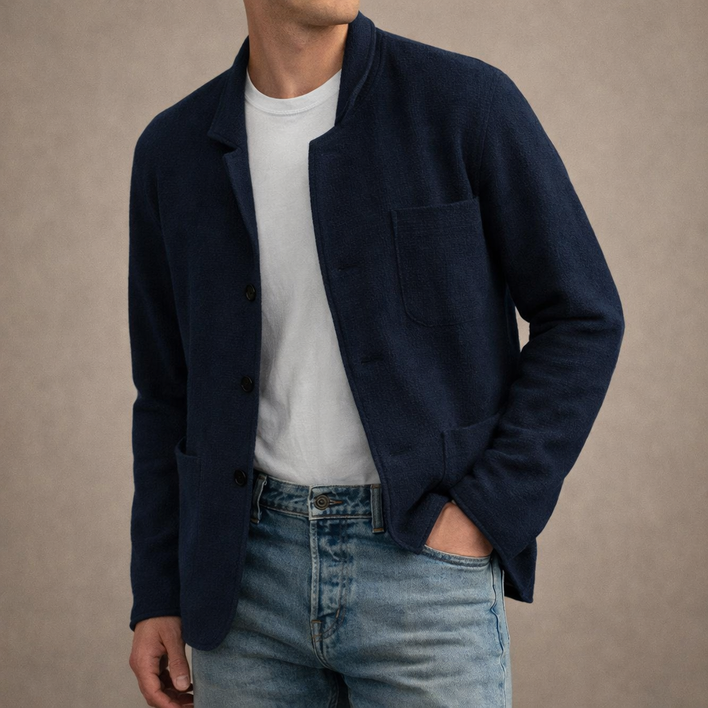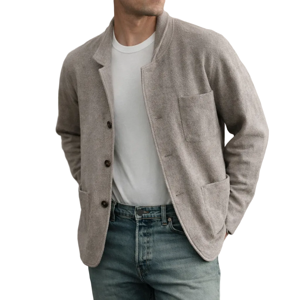 Design: Minimal single-breasted style with a soft collar and clean front fastening
