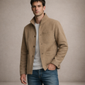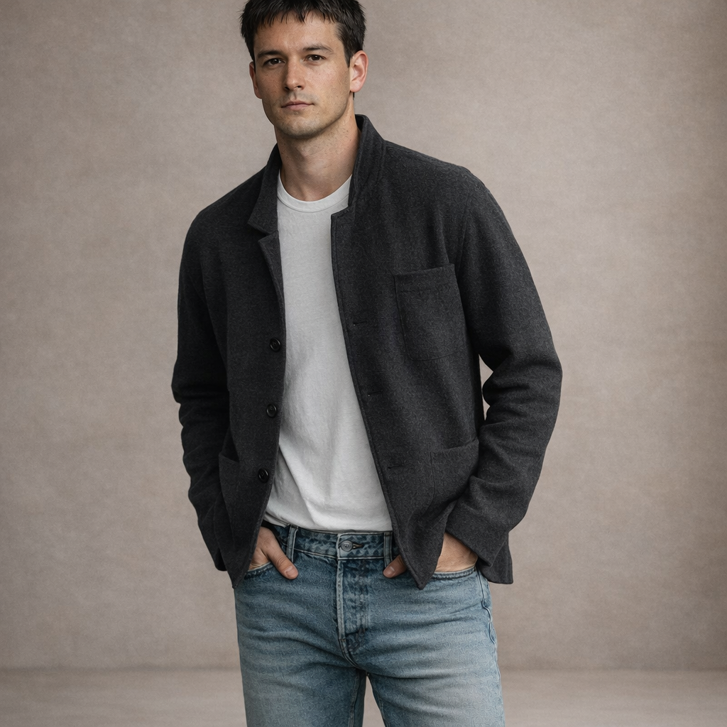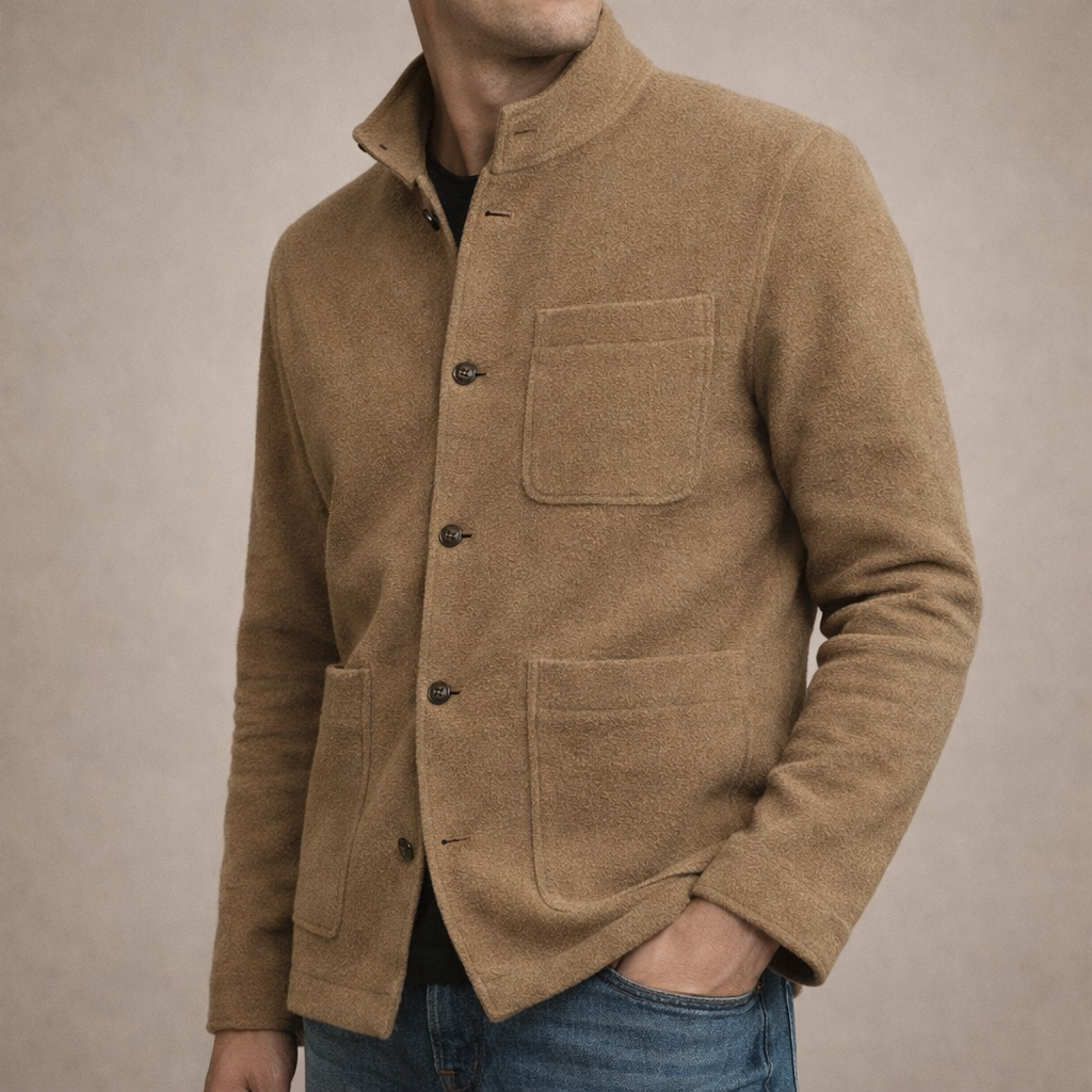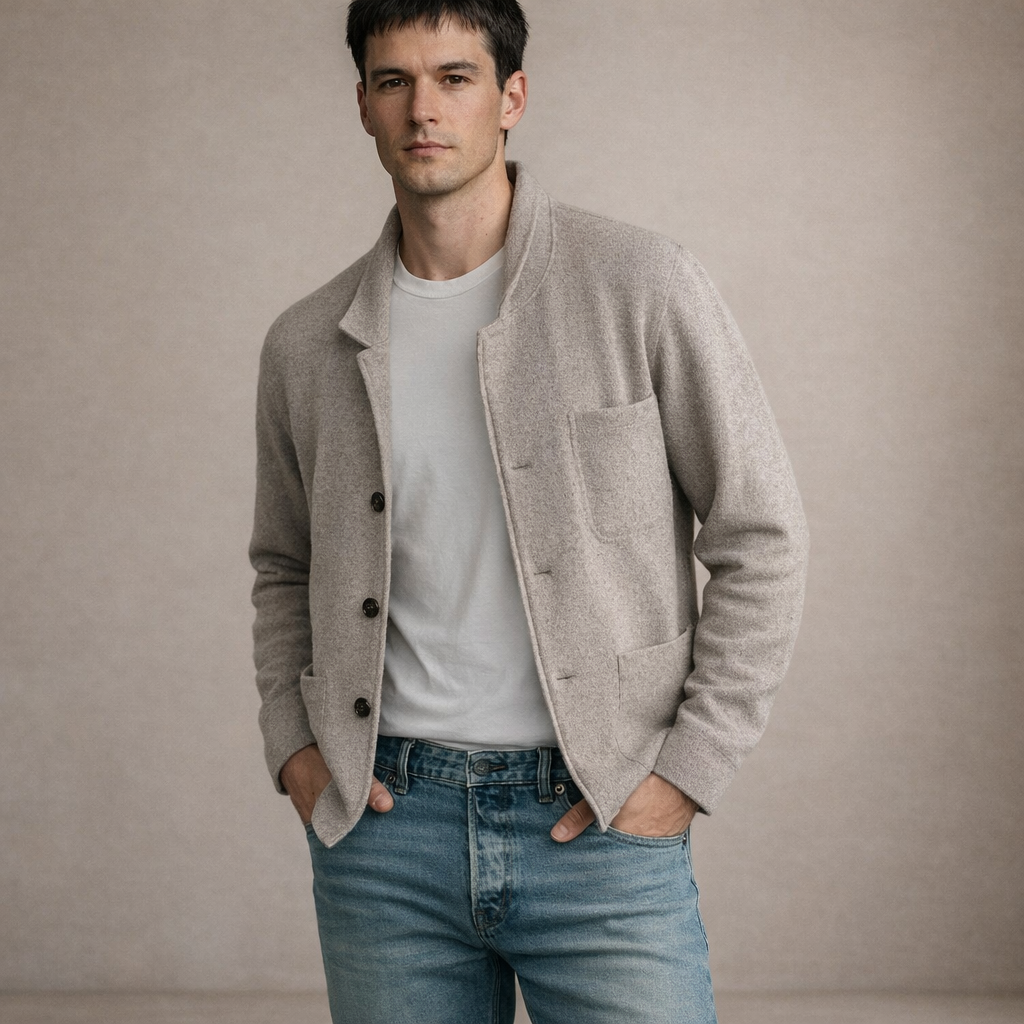 Design: Minimal single-breasted style with a soft collar and clean front fastening