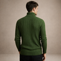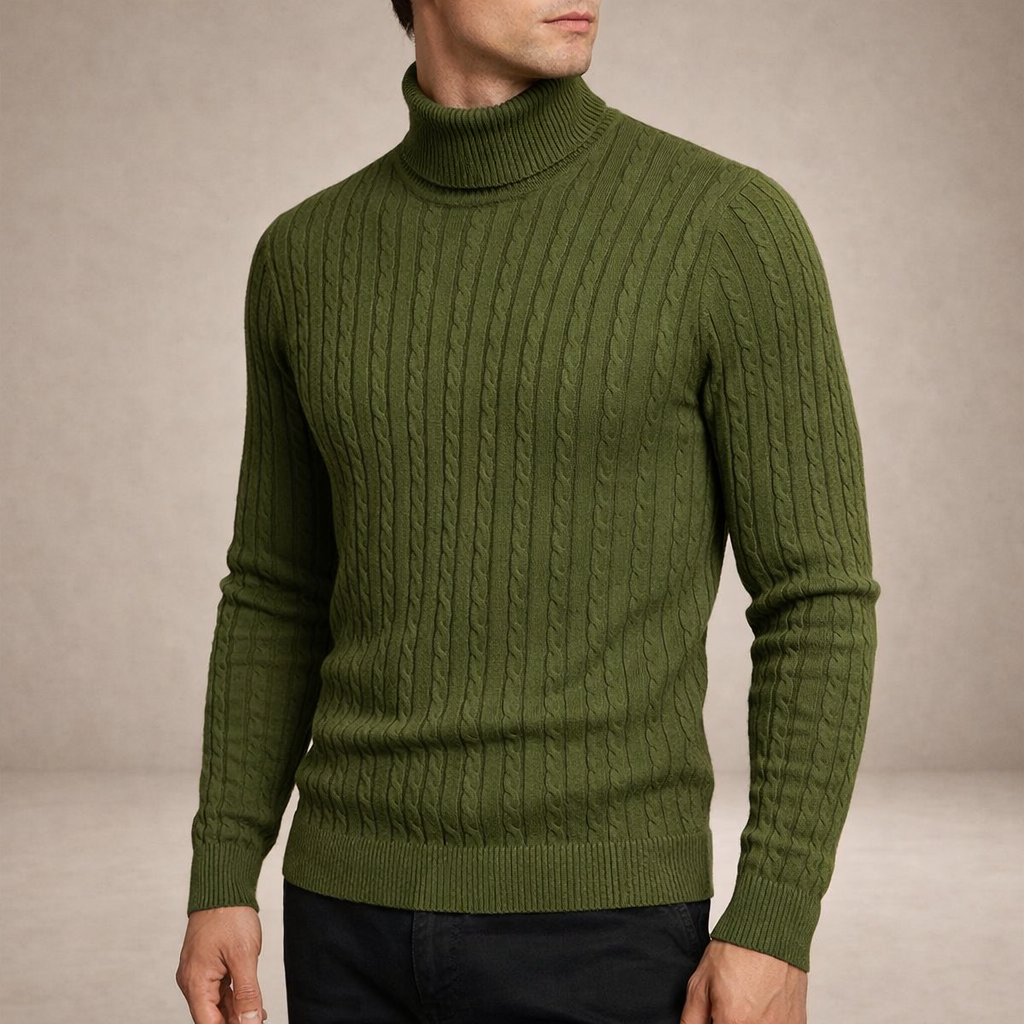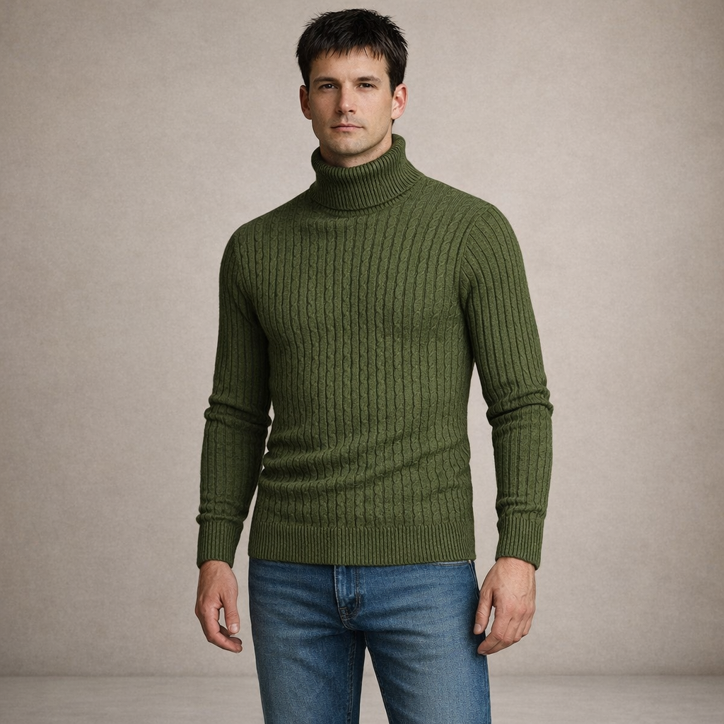 Refined, warm and effortlessly sophisticated, this Men’s Cable Knit Turtleneck Sweater is a timeless cold-weather essential. The structured cable pattern and rich olive tone create a polished look ideal for both smart and casual styling.