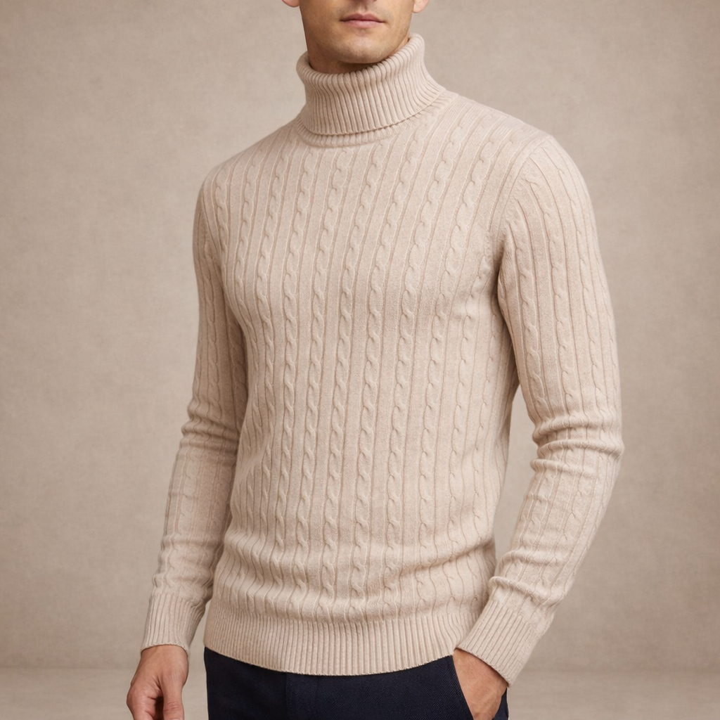 Design: Classic vertical cable knit pattern with a high ribbed turtleneck collar for a distinguished finish
