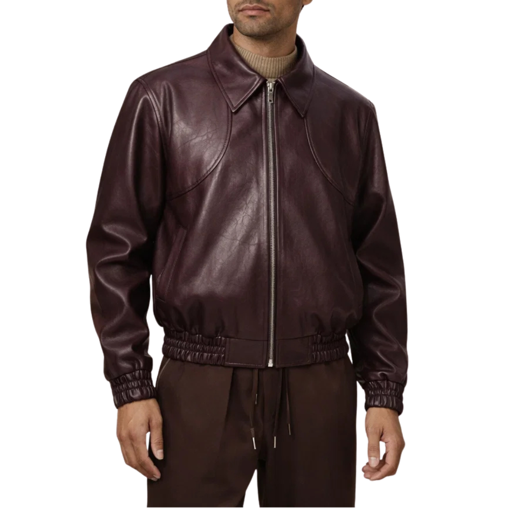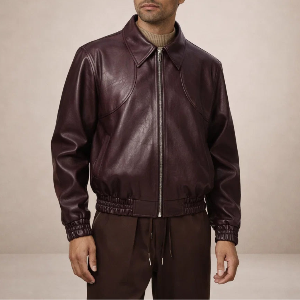Design: Streamlined leather-look jacket with a classic pointed collar and clean front zip closure