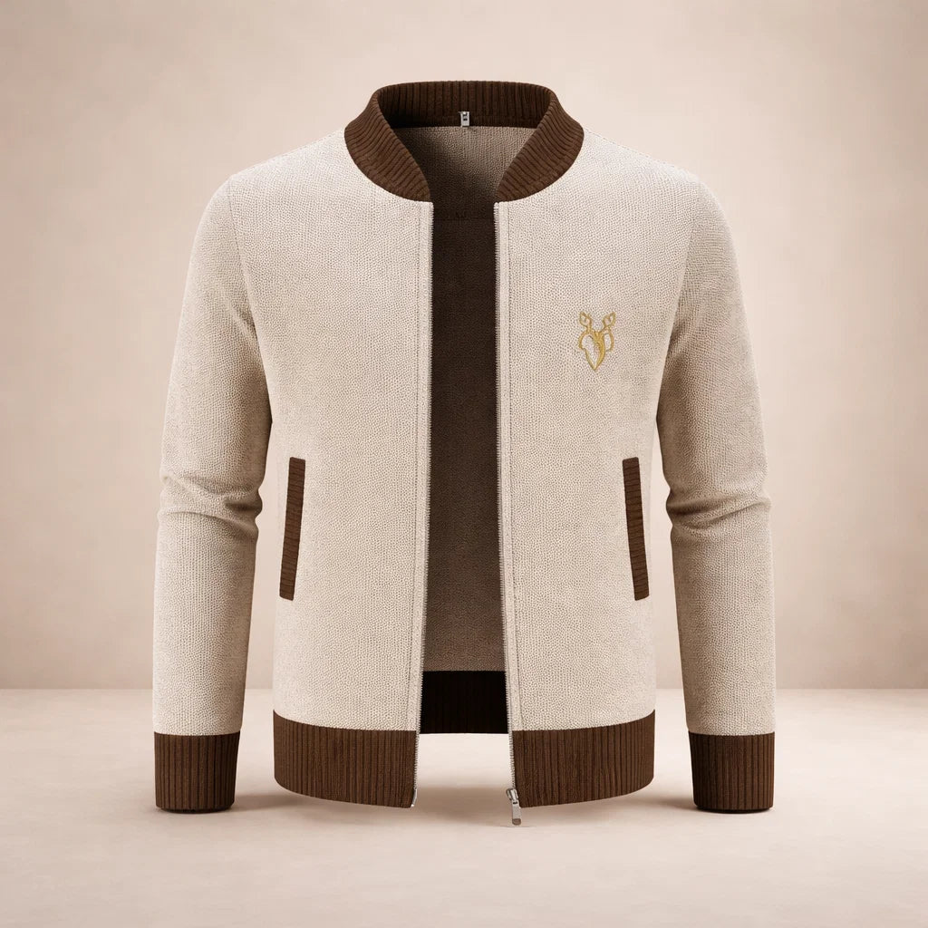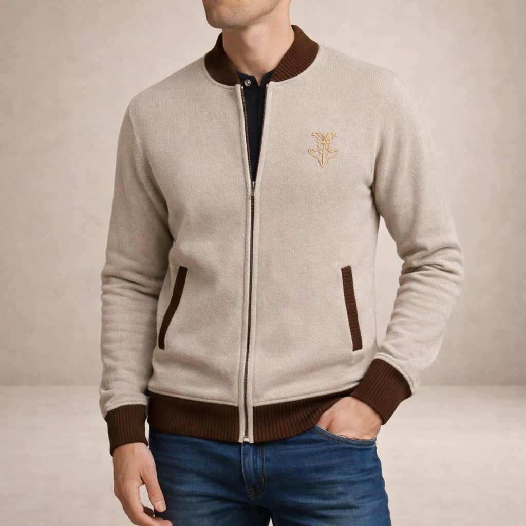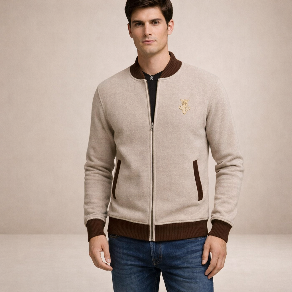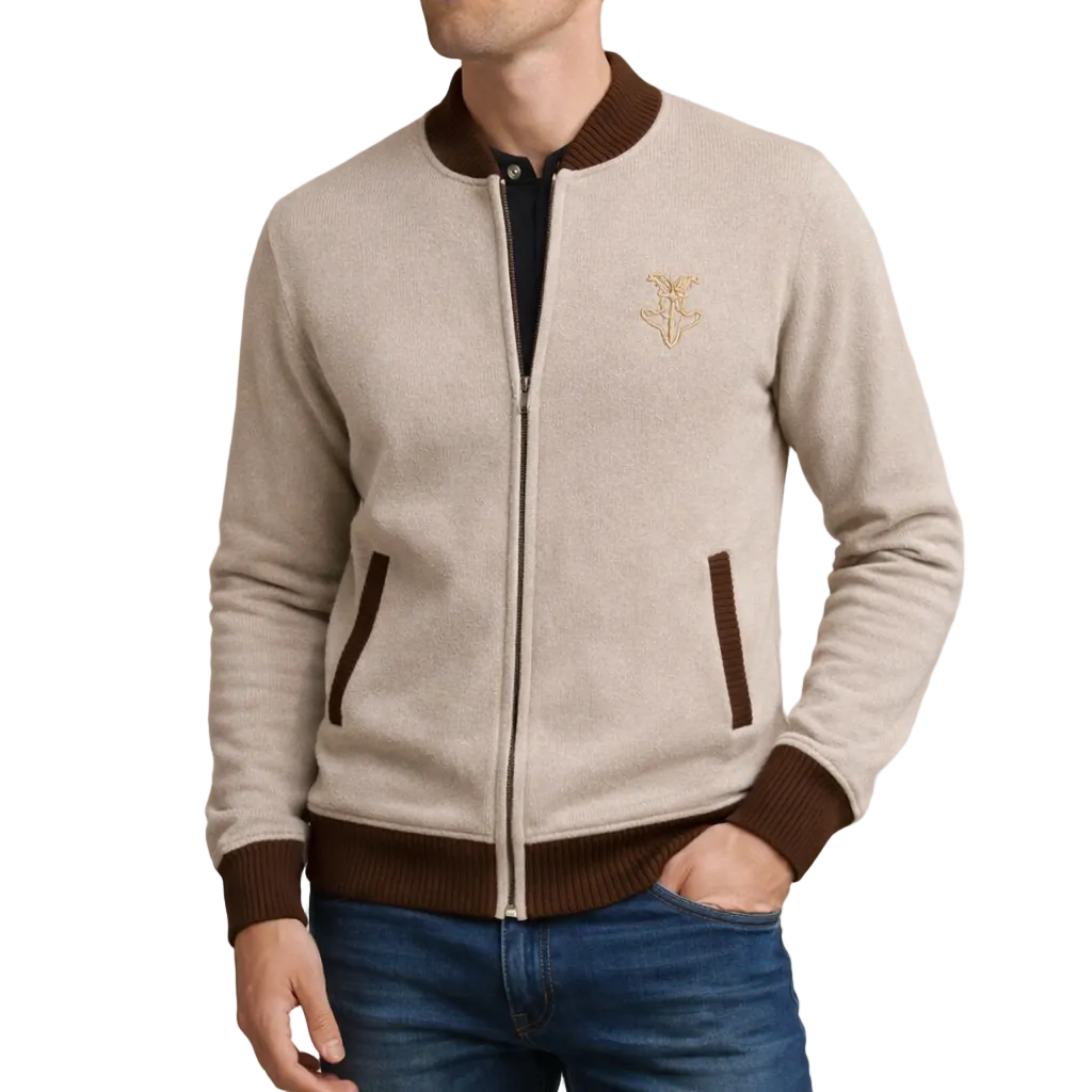 Smart and versatile, this Men’s Contrast Trim Zip-Up Knit Cardigan offers a refined take on casual layering. The neutral base is elevated by rich contrasting trims, creating a balanced look that transitions seamlessly from relaxed weekends to smart-casual occasions. Worn over a polo or shirt, it delivers effortless polish with everyday comfort.