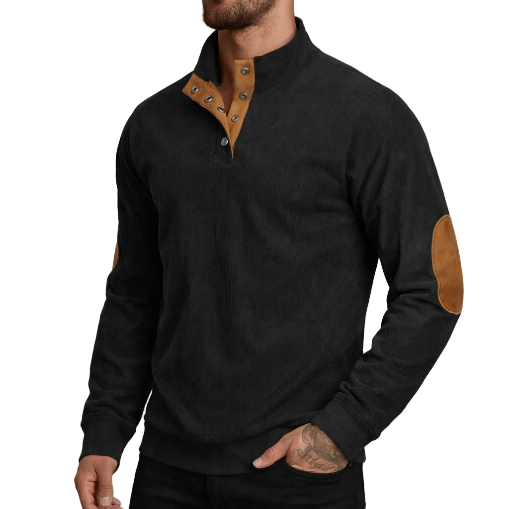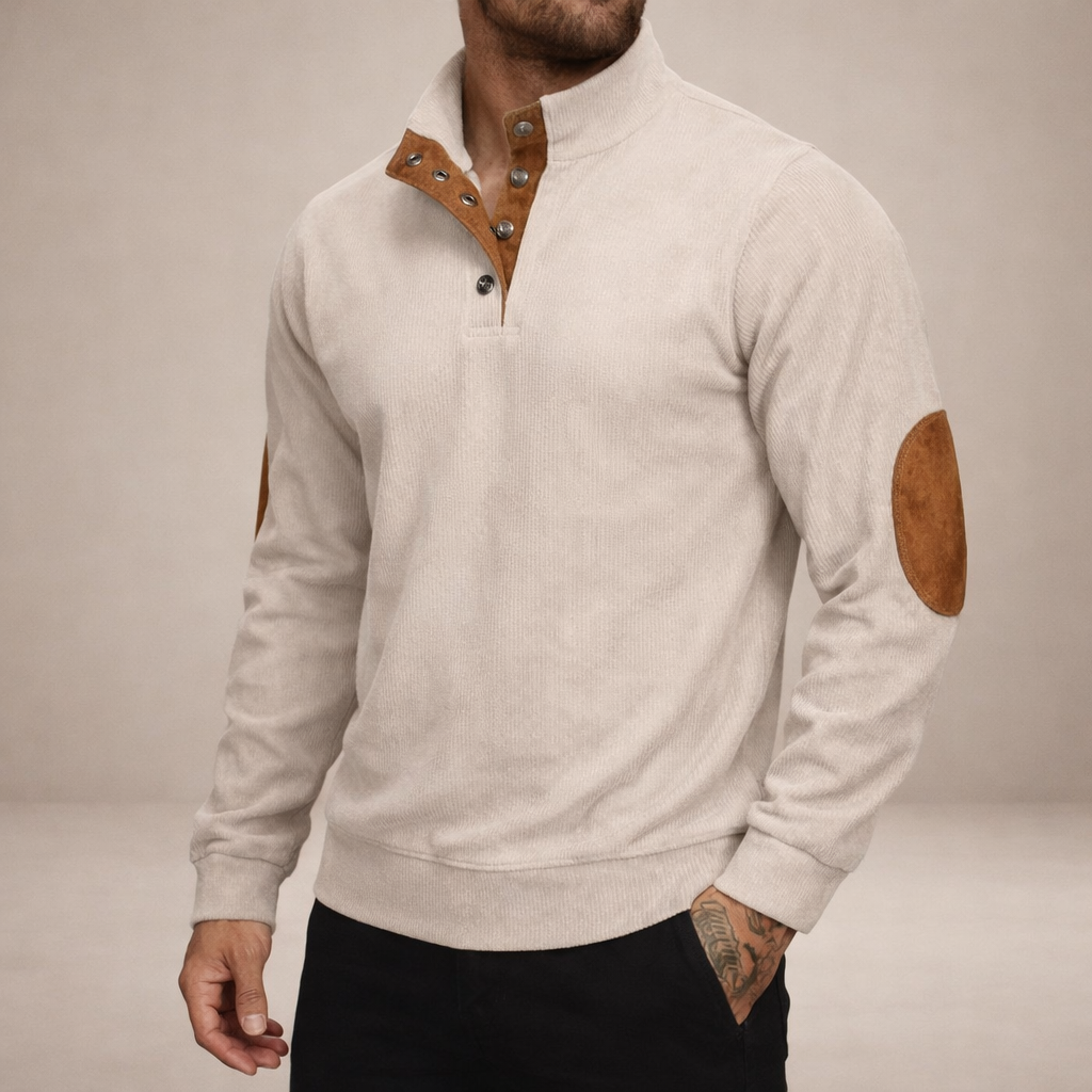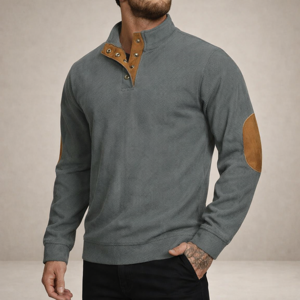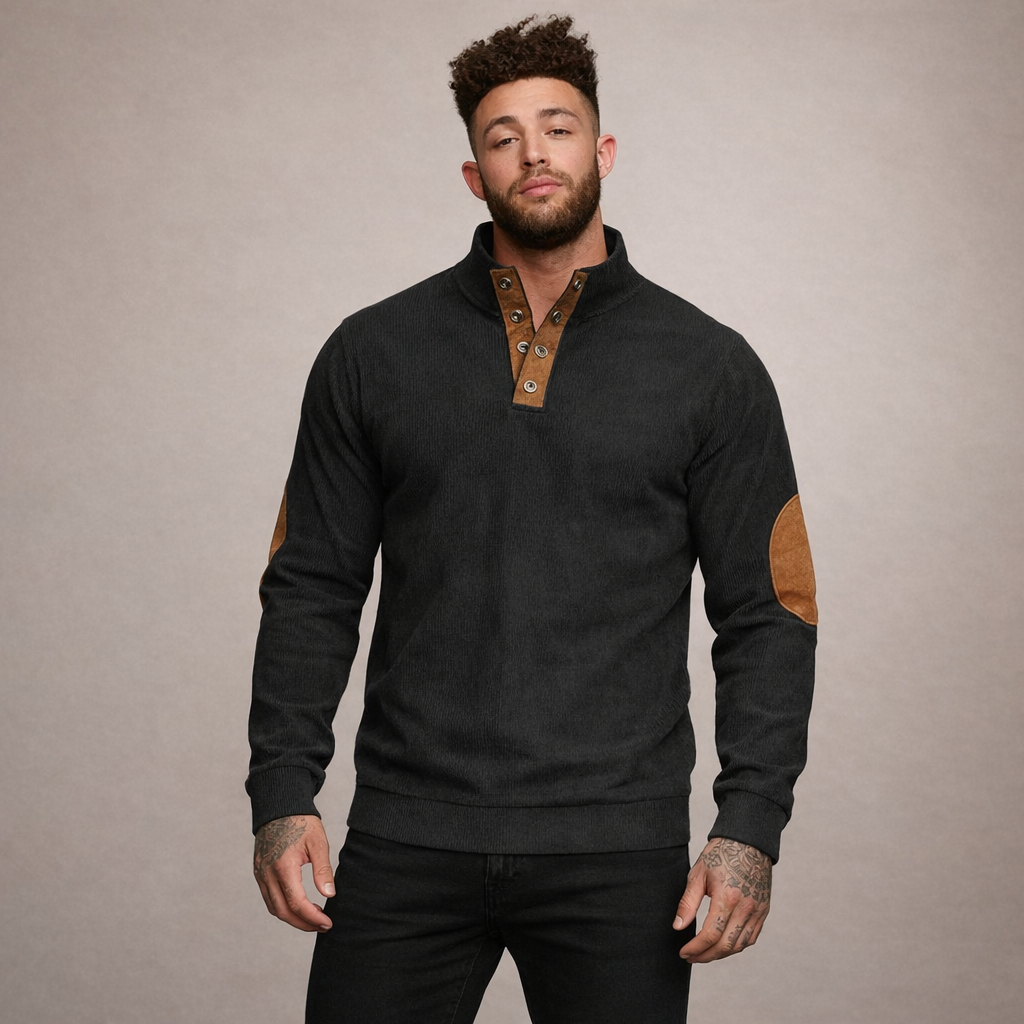 Men’s Corduroy Pullover with Button Neck and Elbow Patches