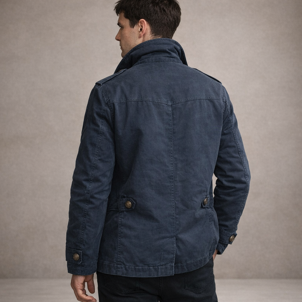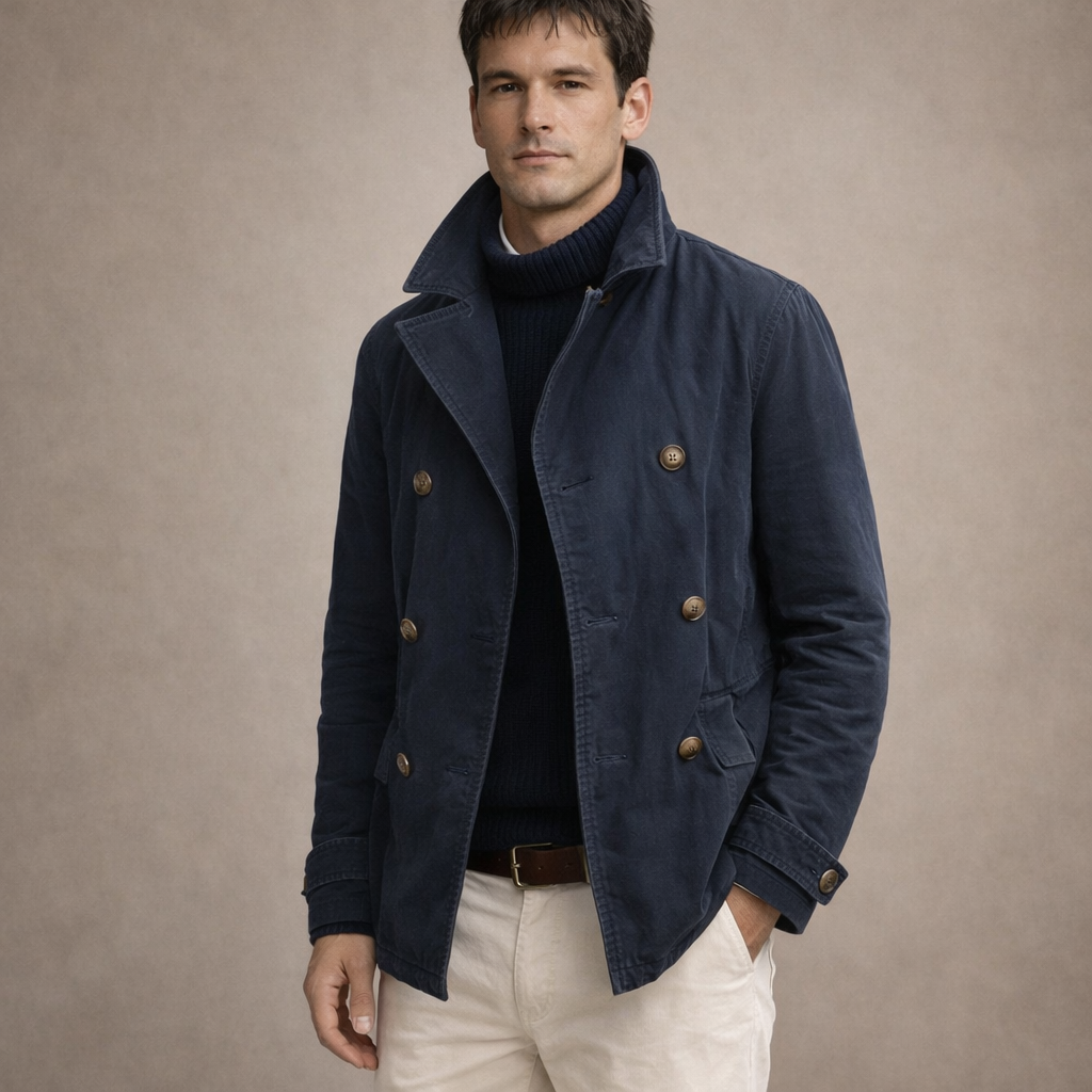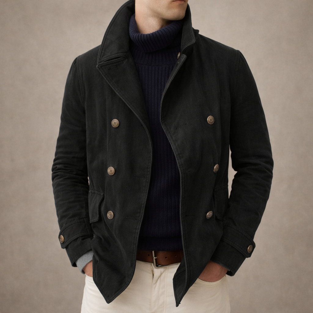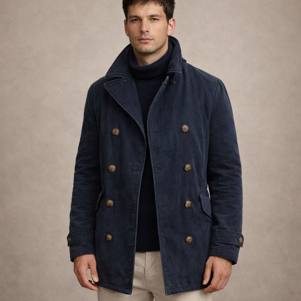 Key features of this Men’s Double-Breasted Pea Coat with Stand Collar