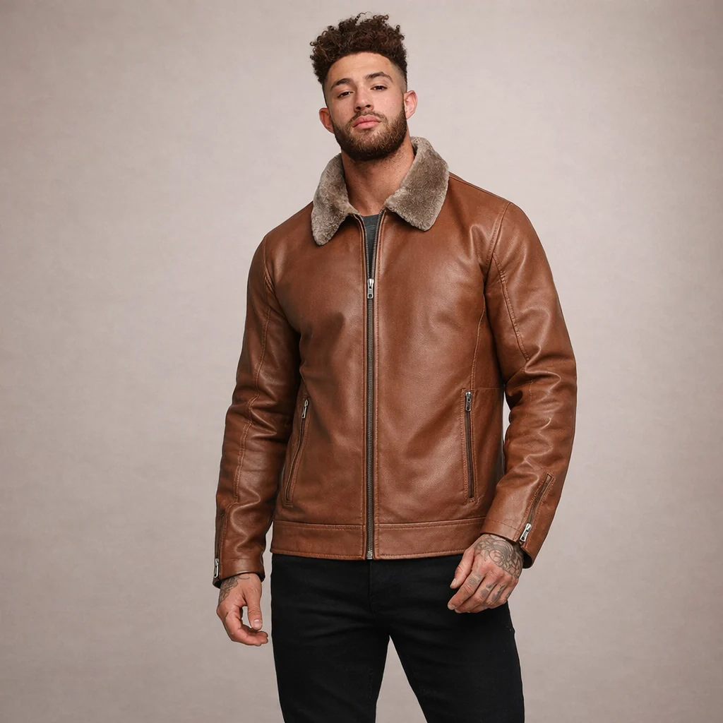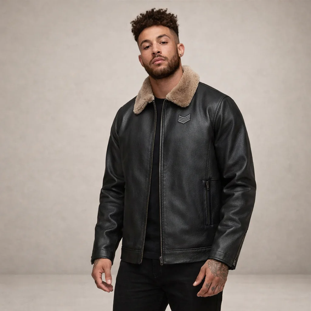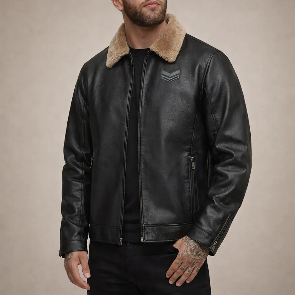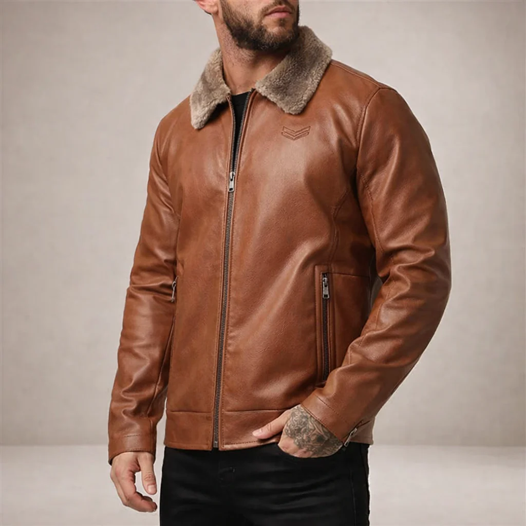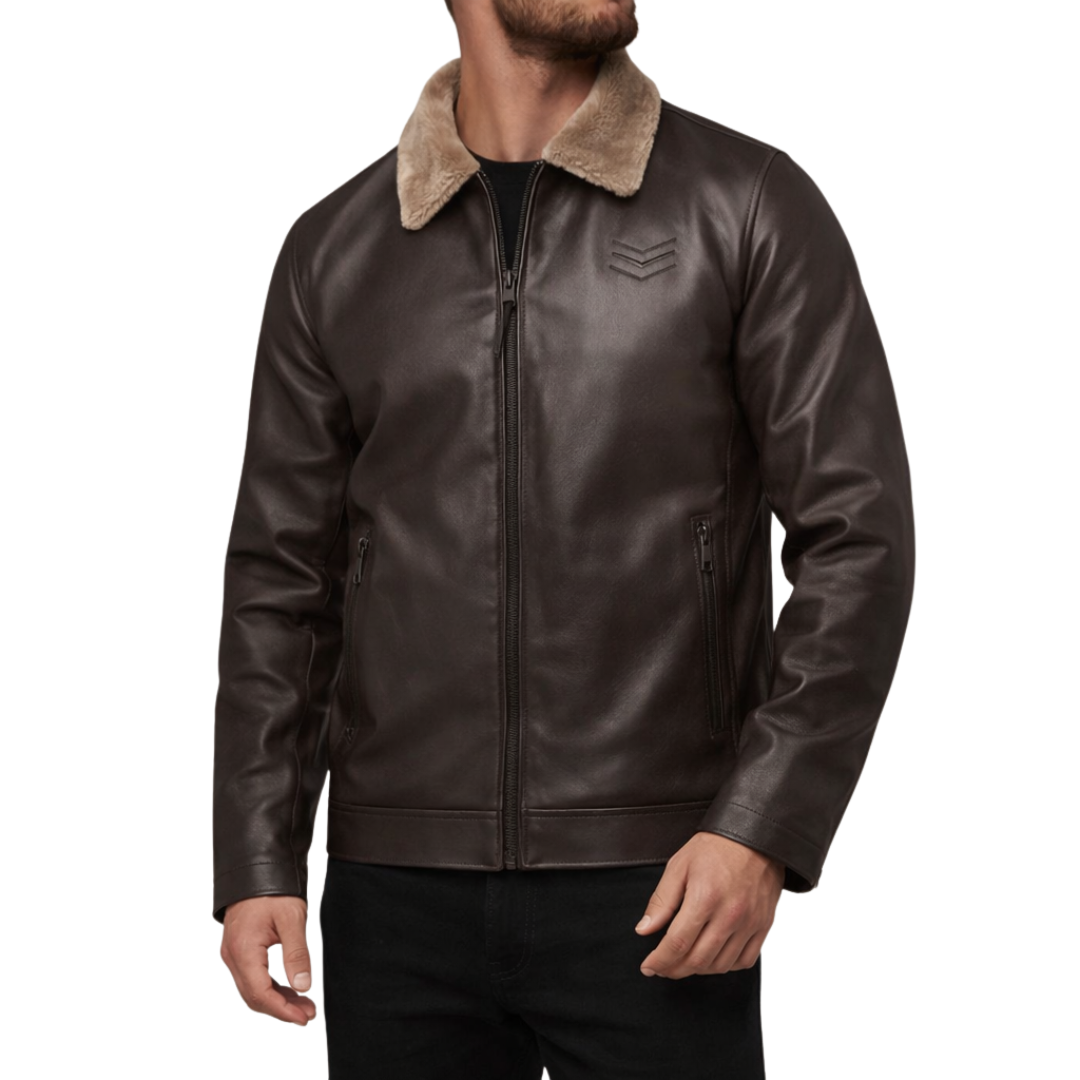 Men’s Faux Leather Jacket with Fleece Collar