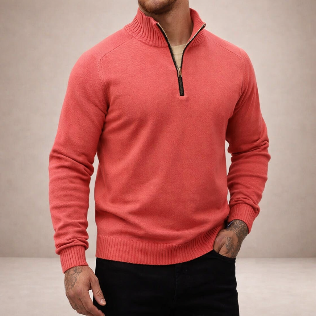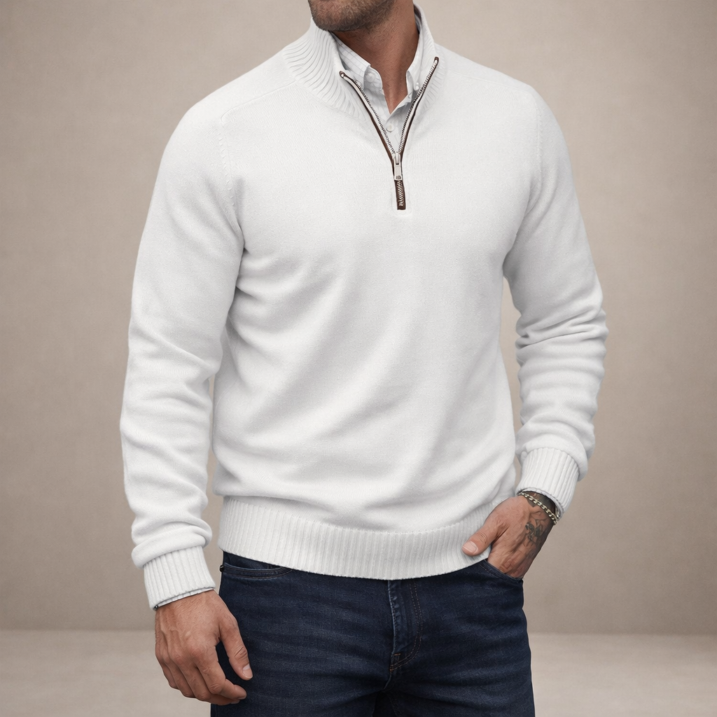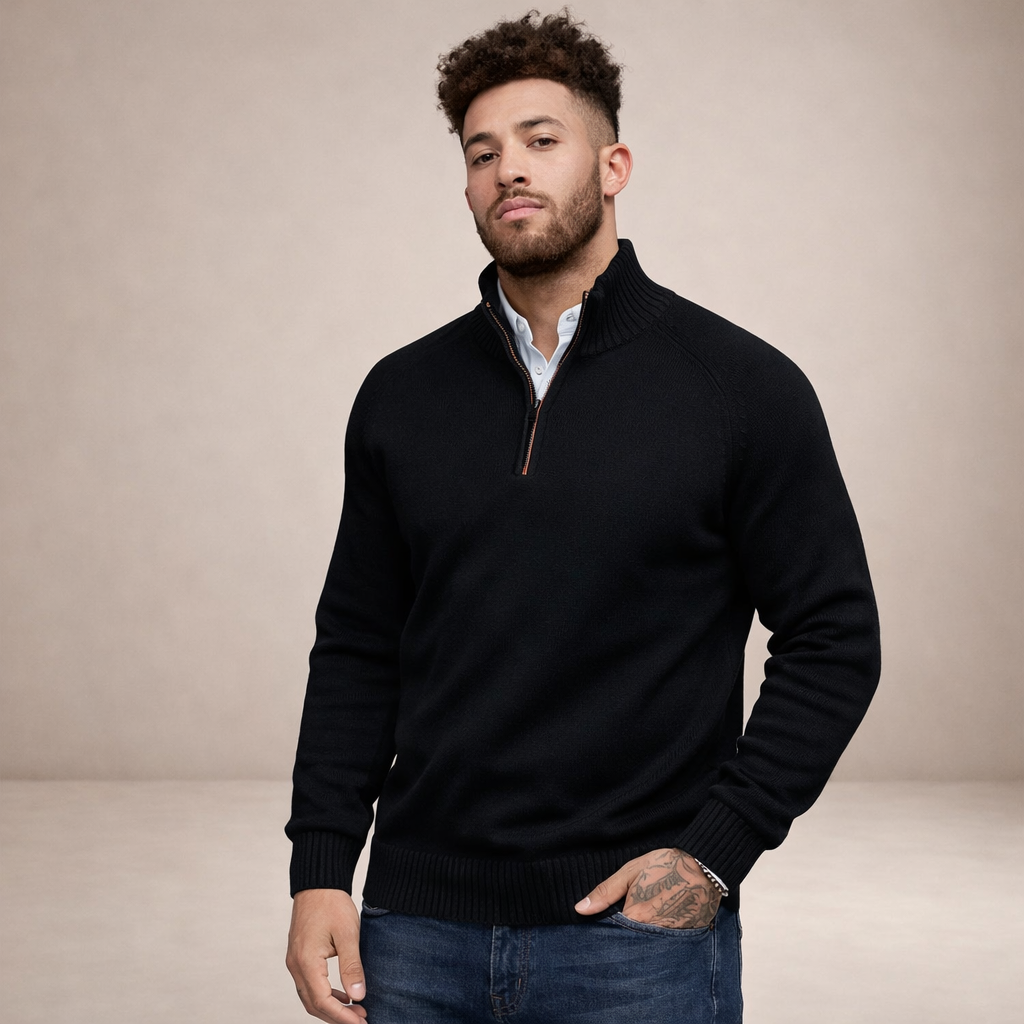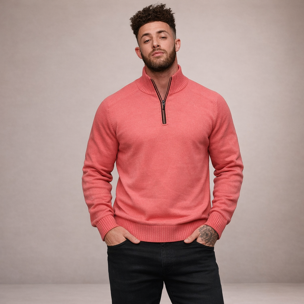 Design: Minimal plain knit with a refined half zip neckline and structured ribbed collar