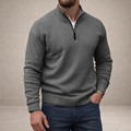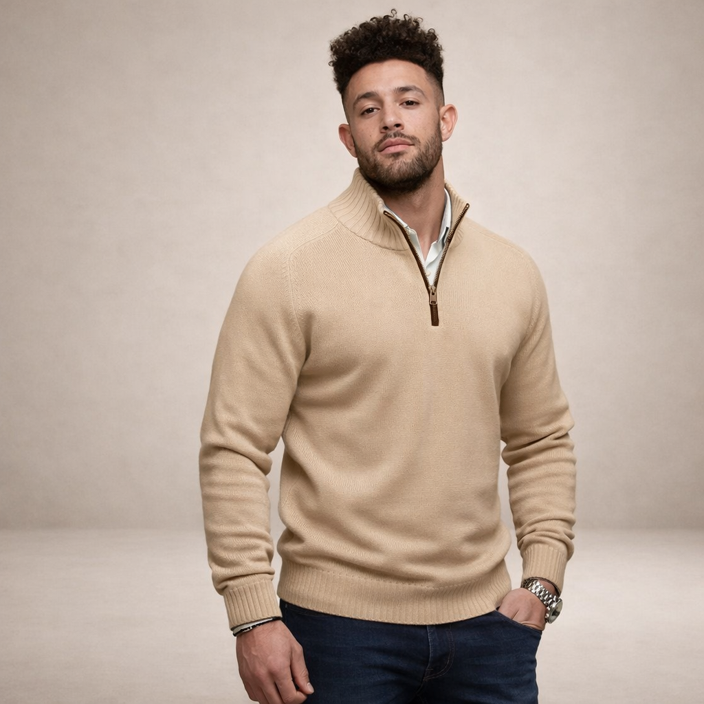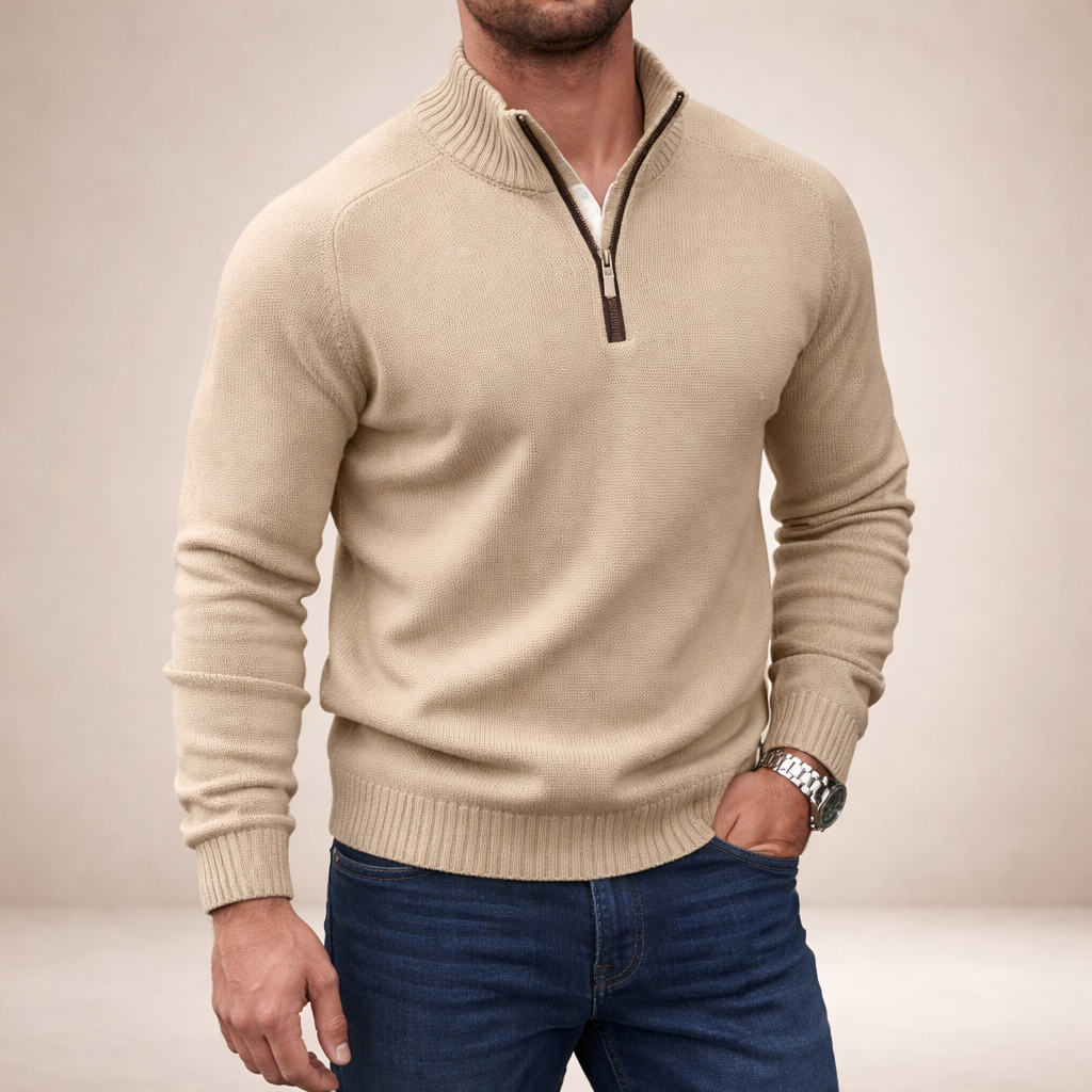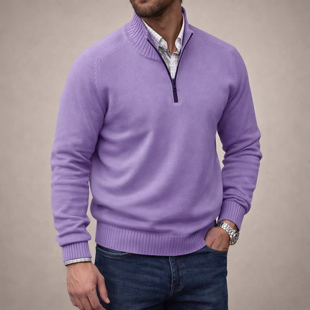 Design: Minimal plain knit with a refined half zip neckline and structured ribbed collar