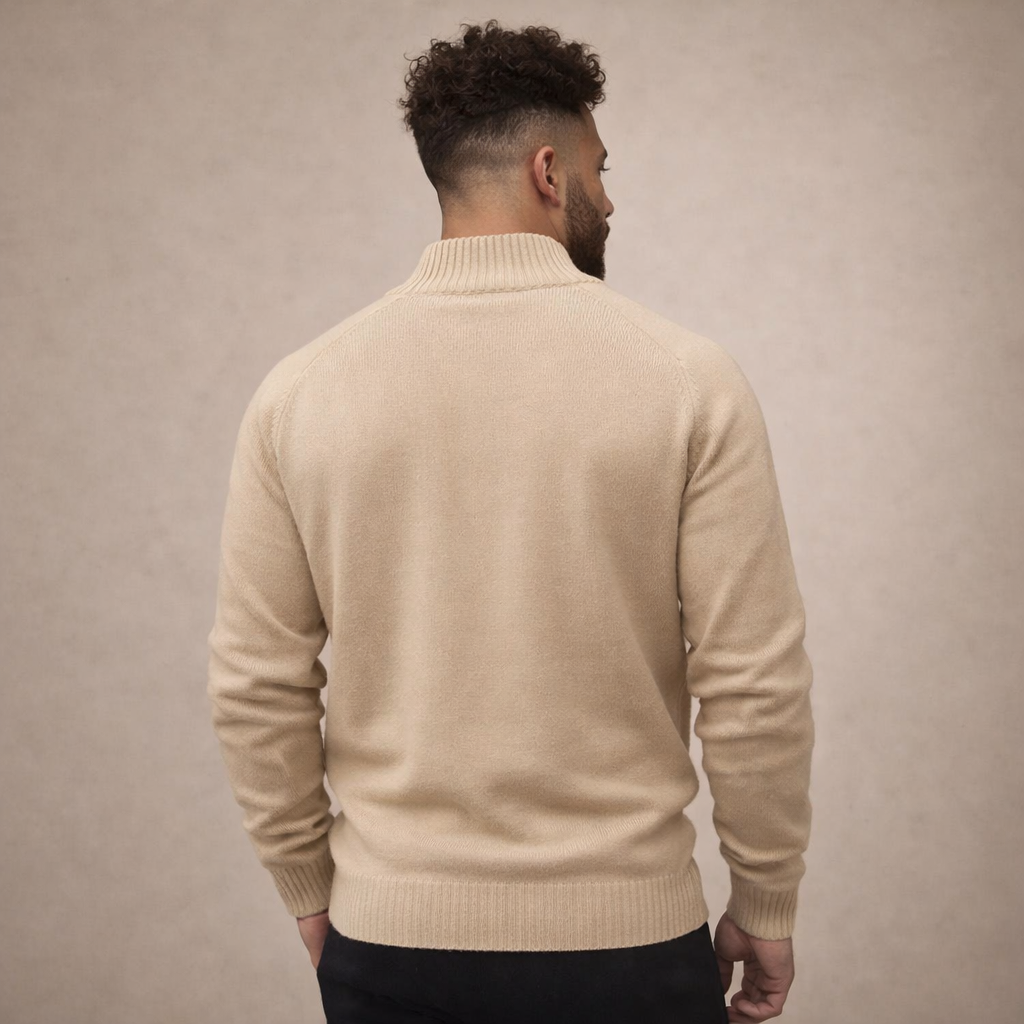 Clean, versatile and easy to wear, this Men’s Half Zip Knit Jumper with Ribbed Collar is a dependable choice for cooler days. The understated design and soft neutral tone make it suitable for both relaxed office settings and weekend outings. Worn alone or layered over a shirt, it delivers effortless smart-casual appeal.