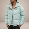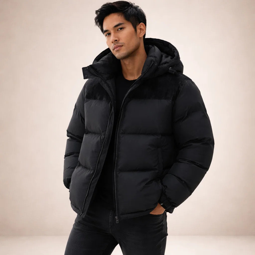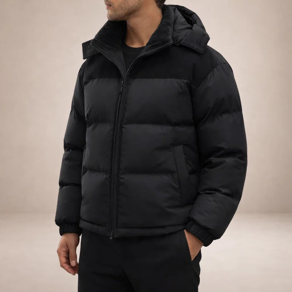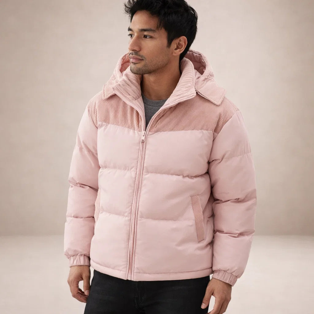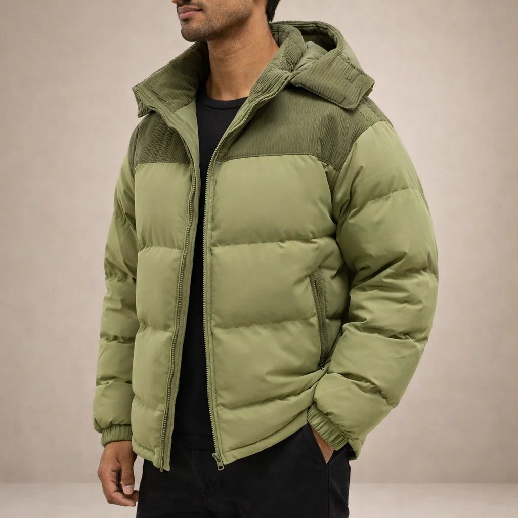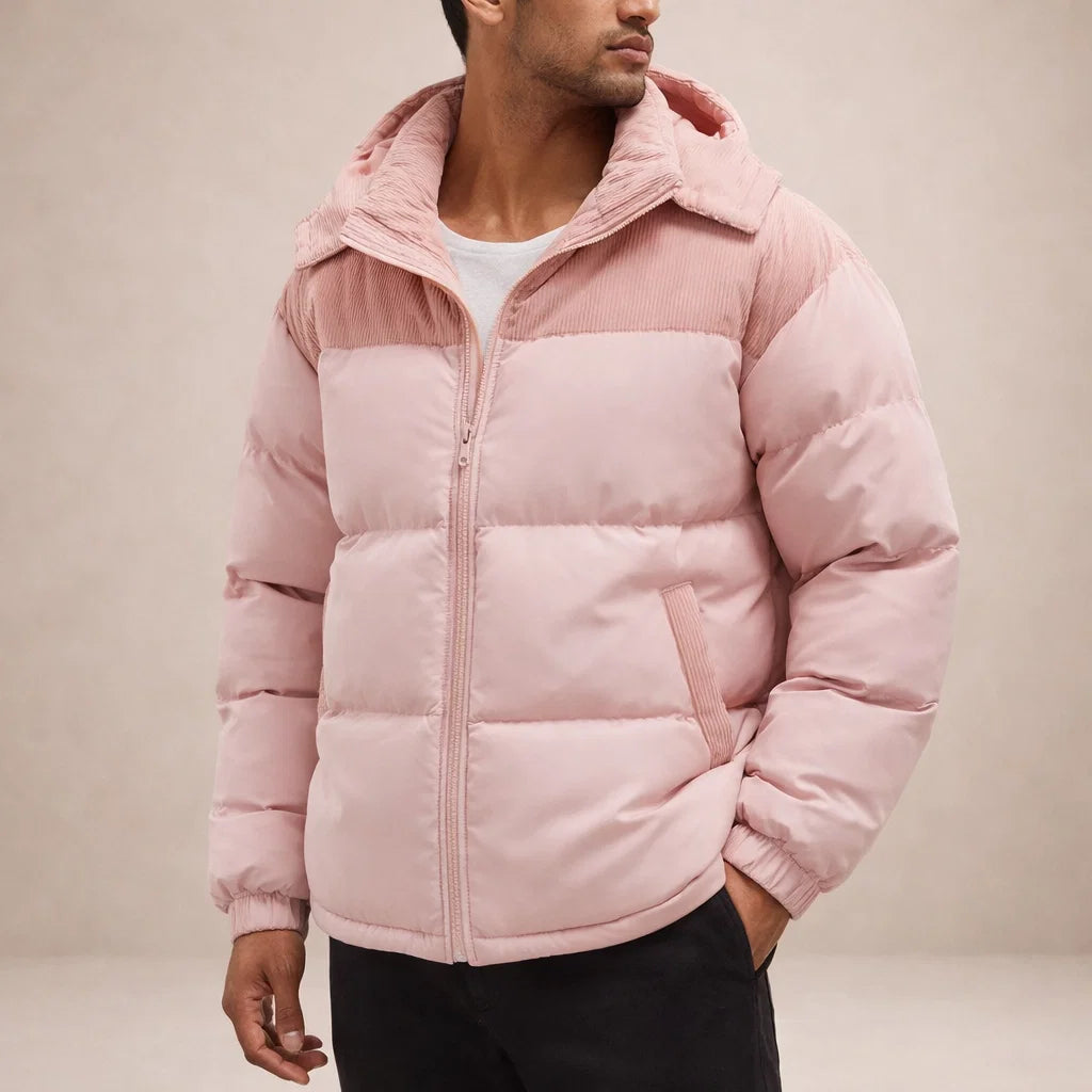 Men’s Hooded Padded Jacket with Zip Front and Contrast Panels
