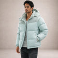 This men’s padded jacket features a hooded design with a full-length zip fastening at the front. The jacket shows a quilted construction with horizontal padding sections and contrast fabric panels across the upper chest and shoulders. Long sleeves and a smooth outer surface are visible, with pockets positioned at the hip area.