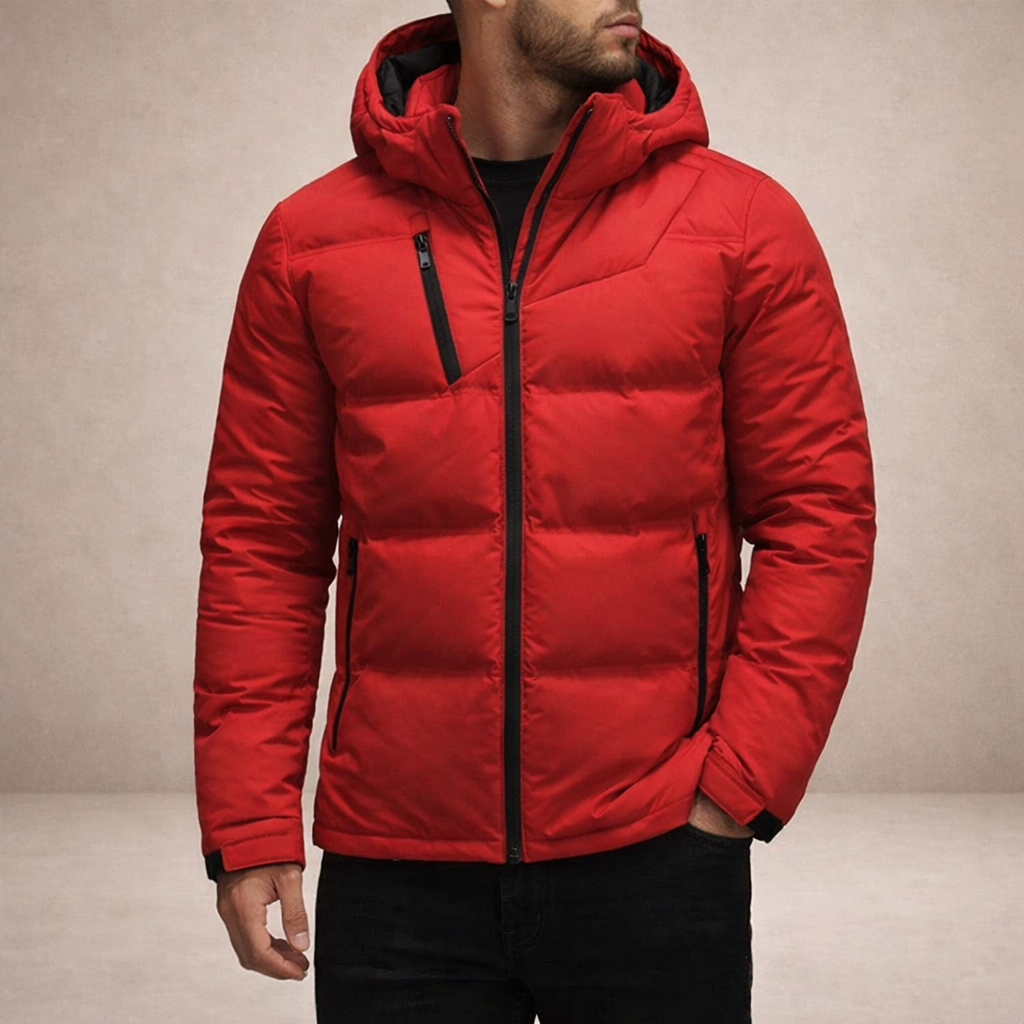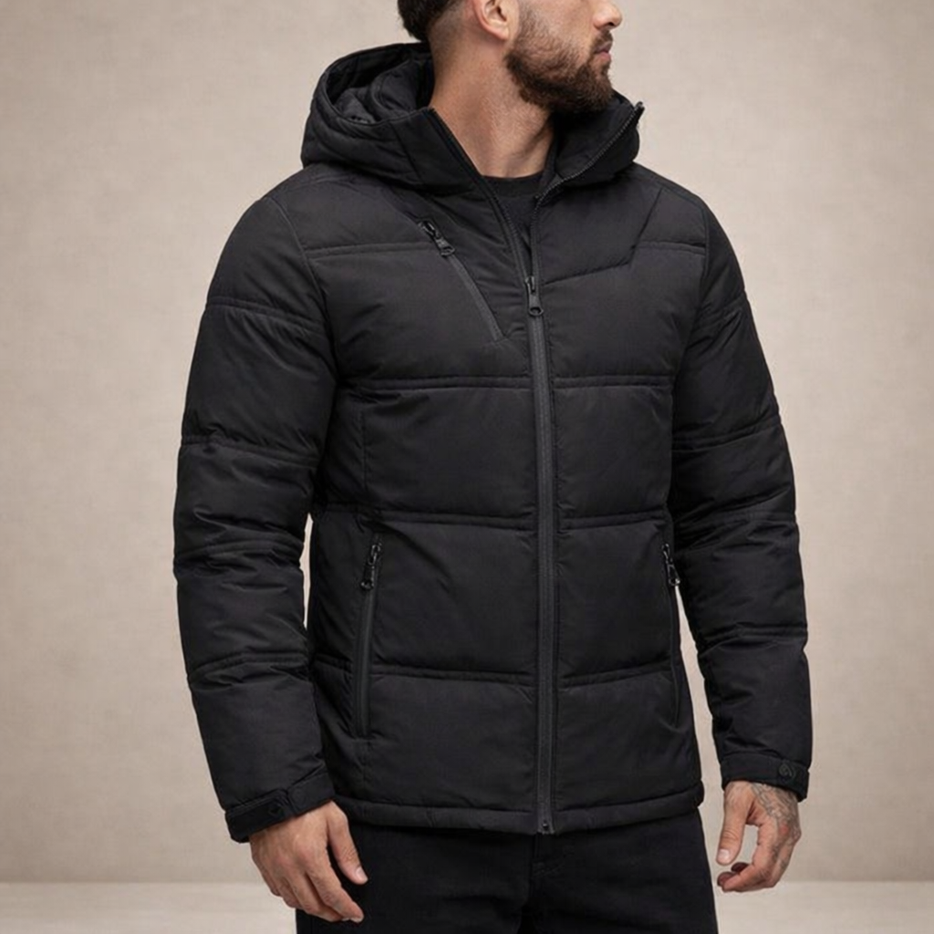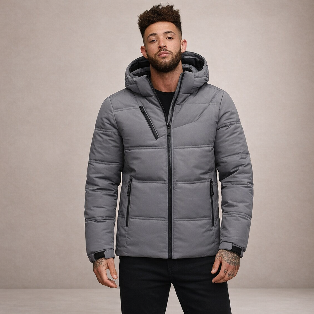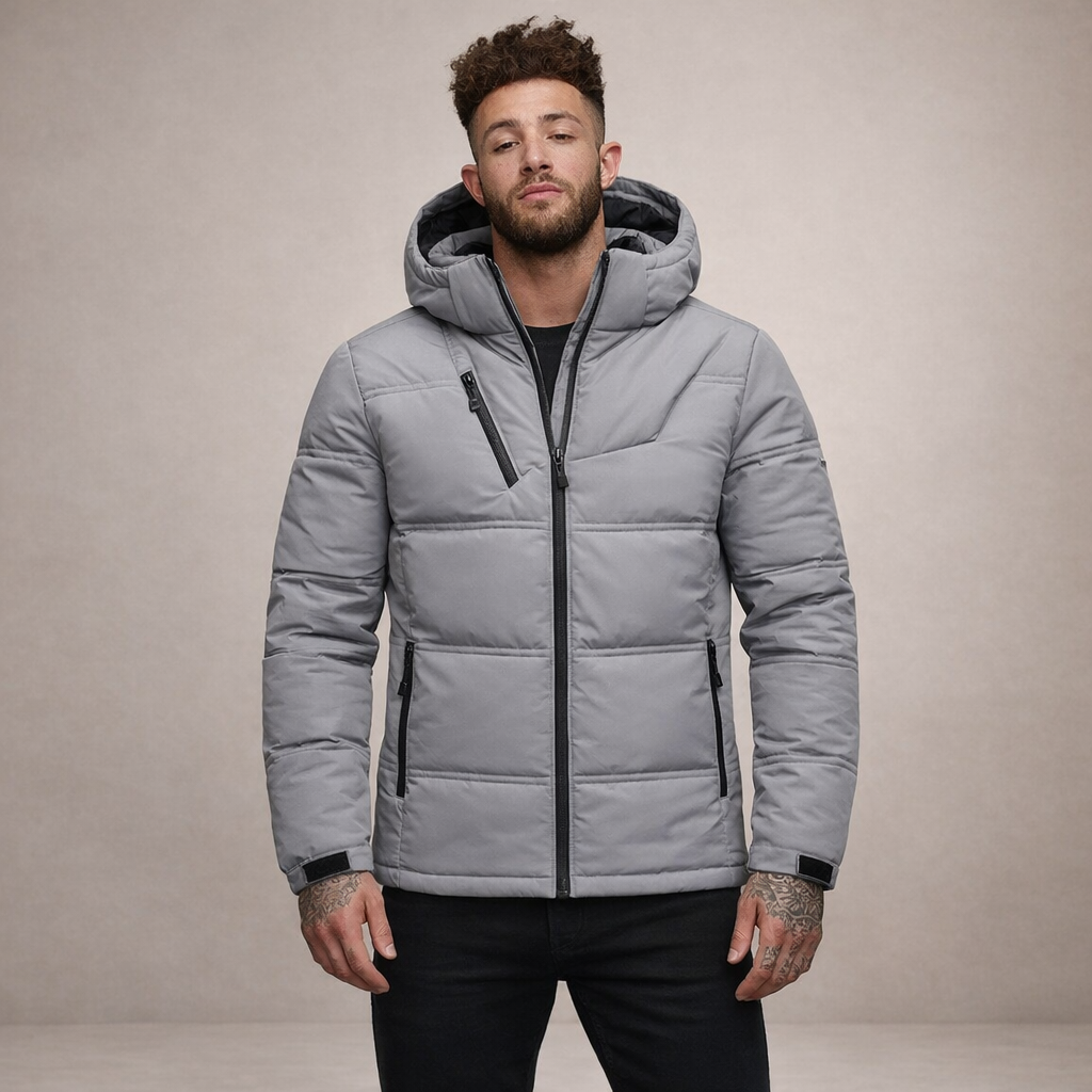 Design: Structured quilted construction with a padded hood and sleek contrast zip accents for a sharp, modern finish