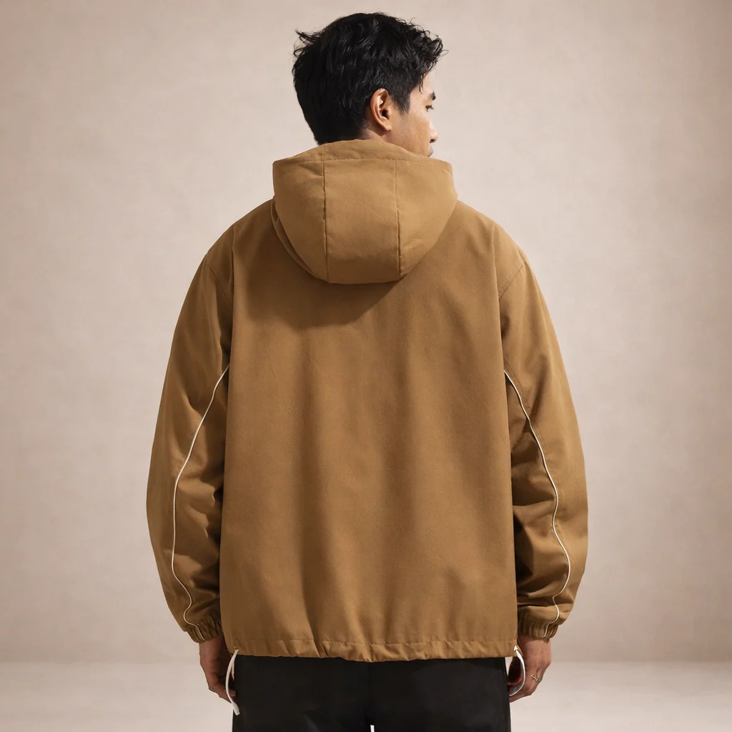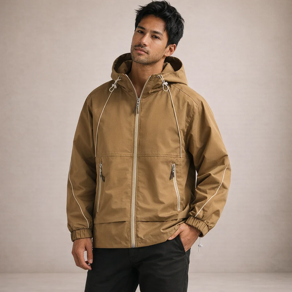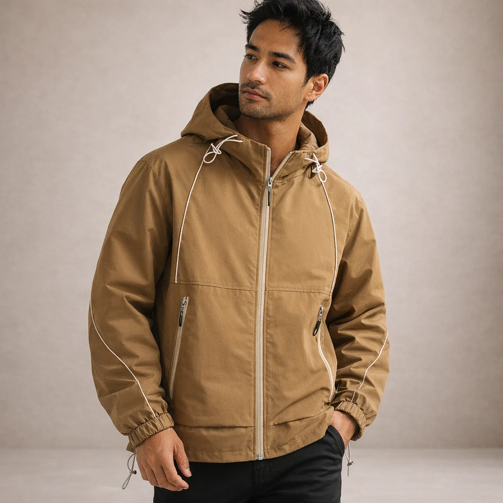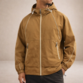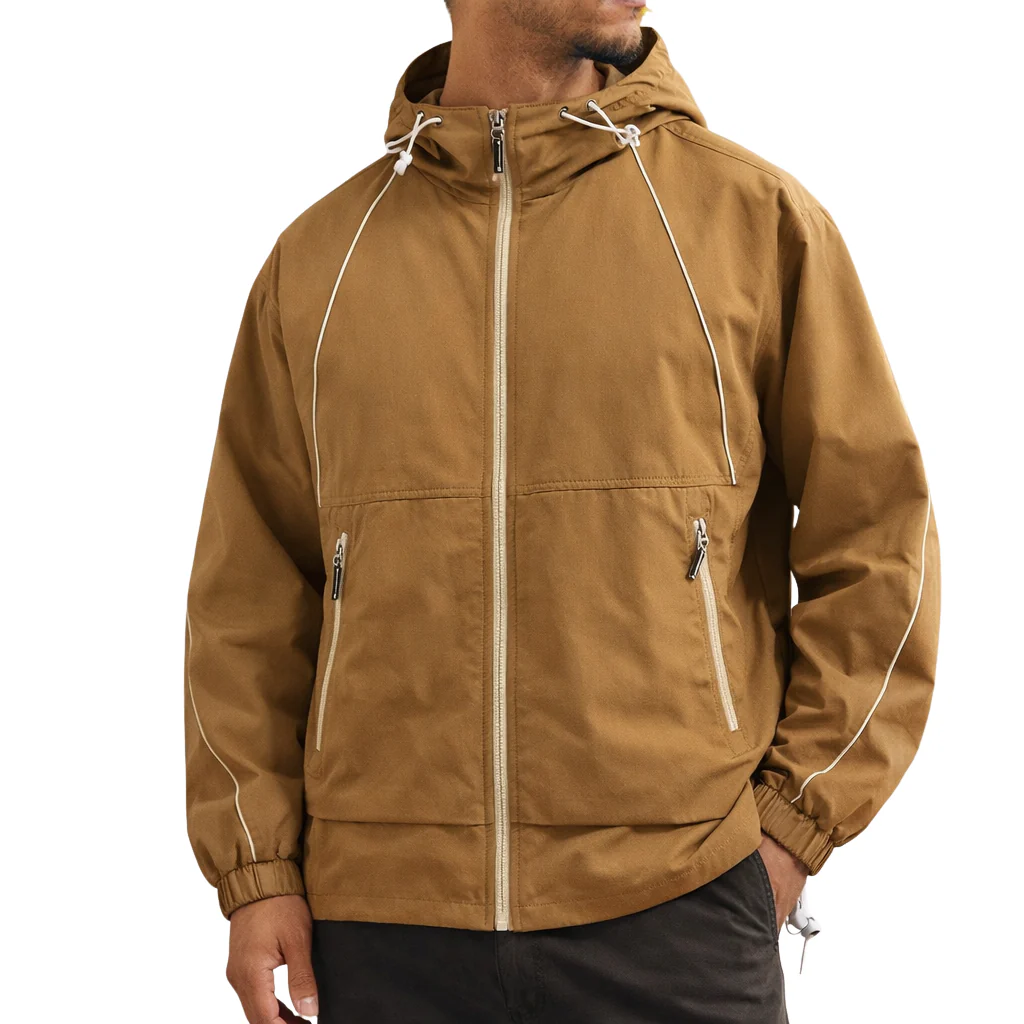 Key features of this Men’s Hooded Zip Jacket with Contrast Piping in Tan