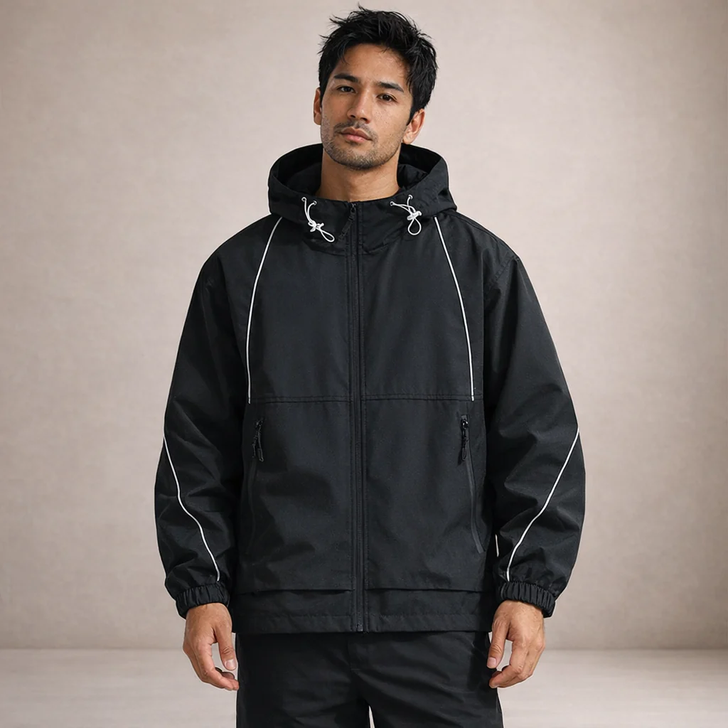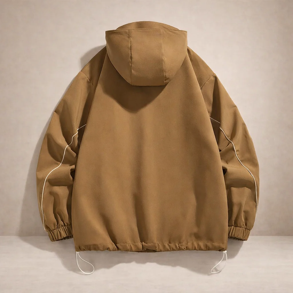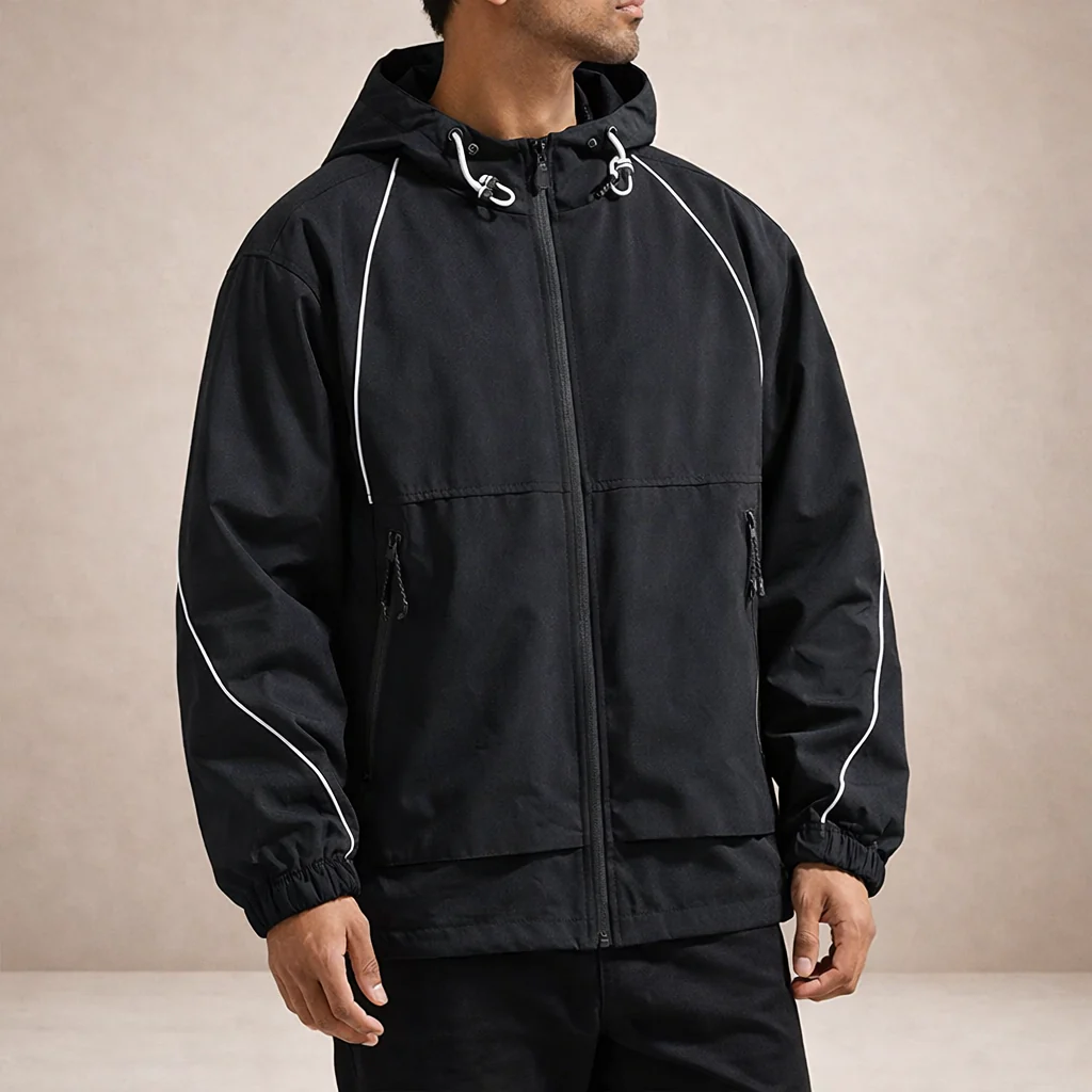 Details: Adjustable hood with drawcords, contrast piping accents, elasticated cuffs, and zip pockets