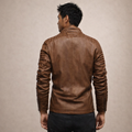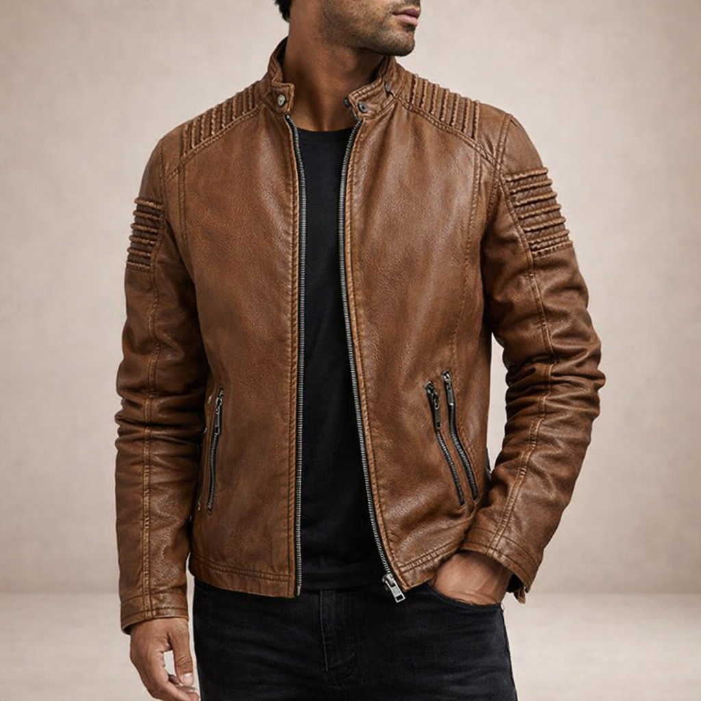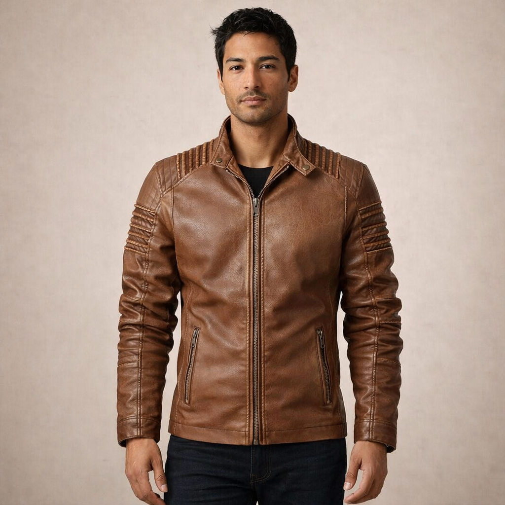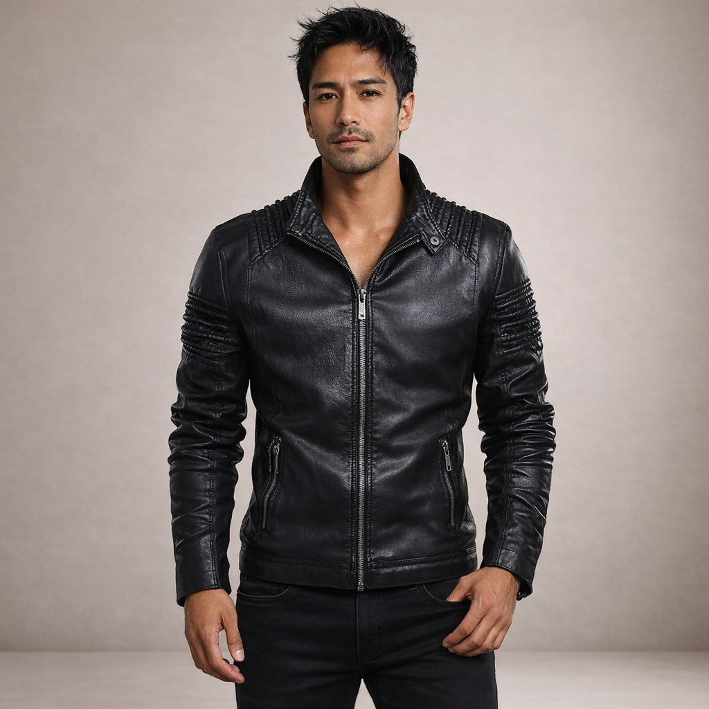 Men’s Leather Biker Jacket with Quilted Shoulder Panels