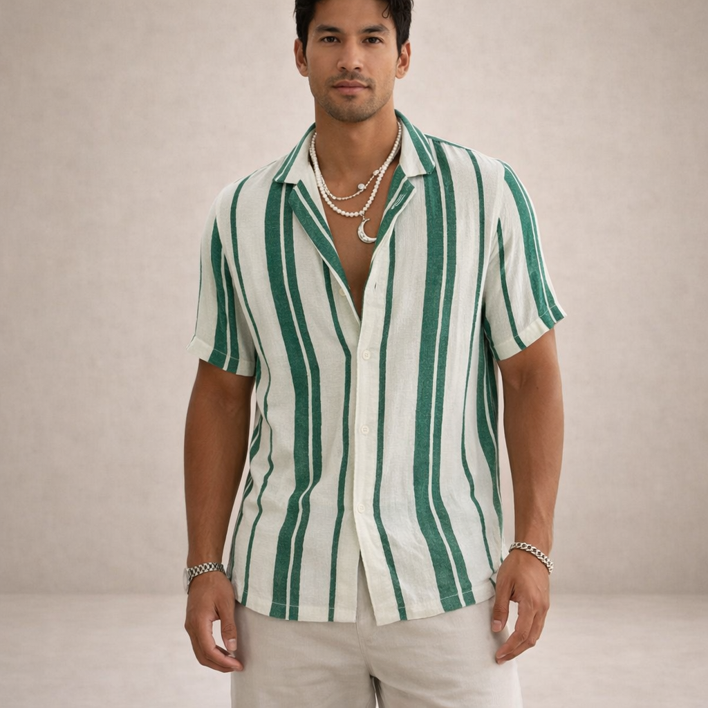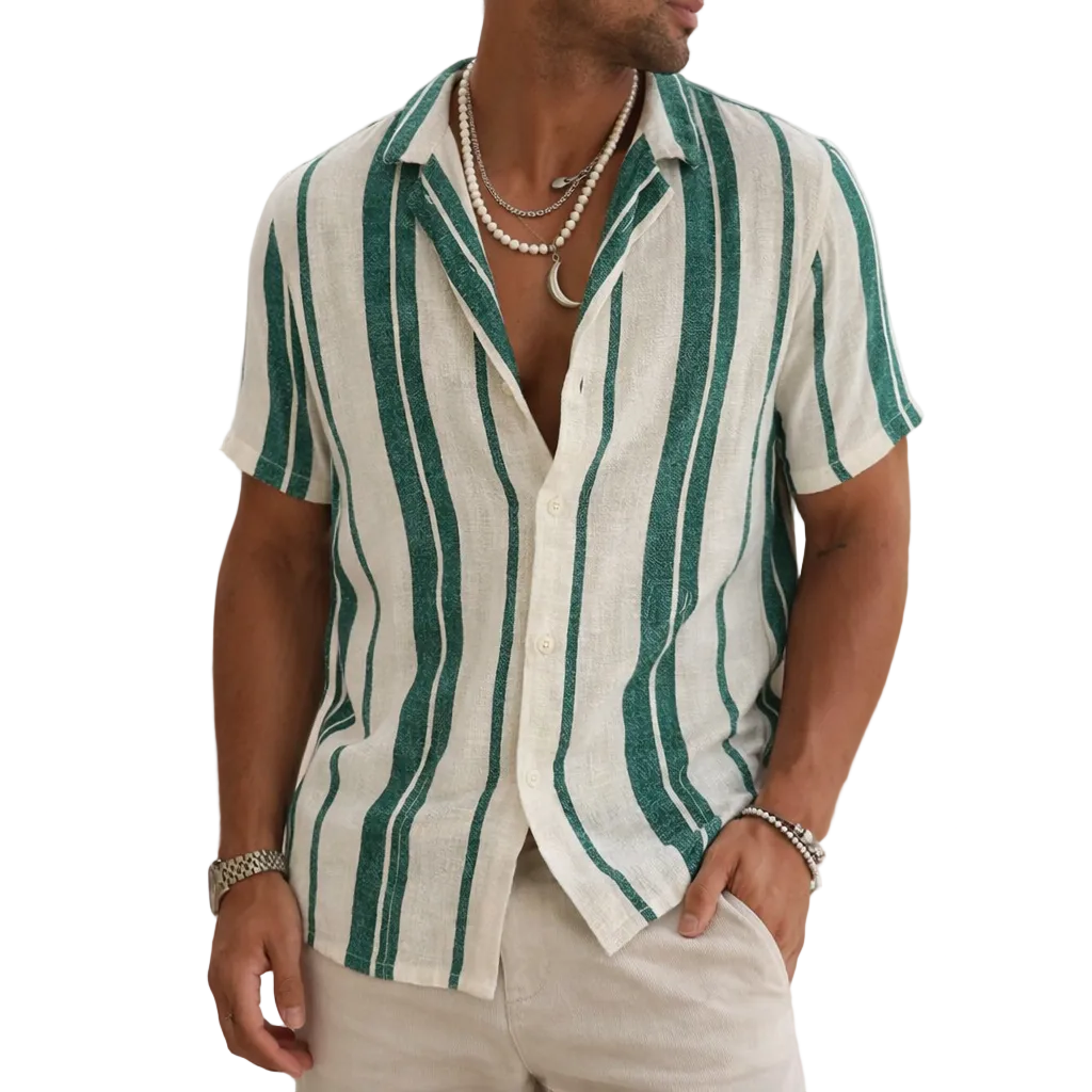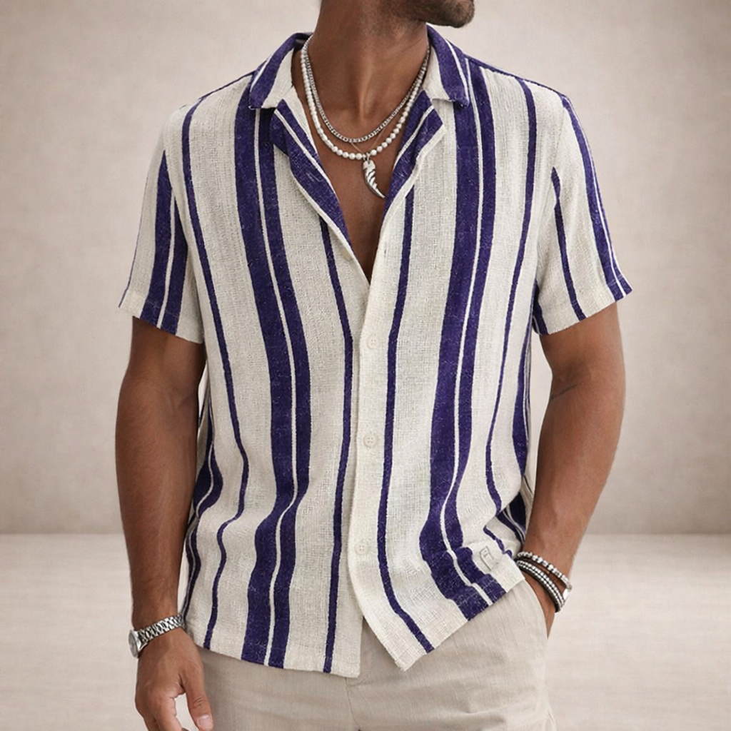 This men’s striped linen summer shirt captures a relaxed, vintage-inspired look with a refined modern edge. Lightweight and breathable, it’s perfect for warm-weather days, whether styled for holidays, coastal outings or casual city wear.