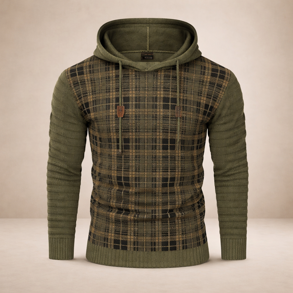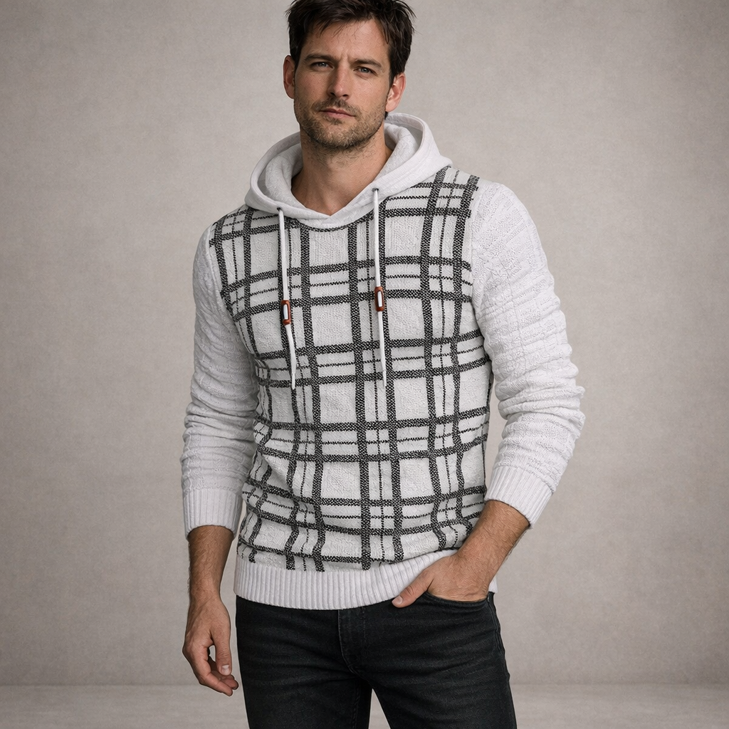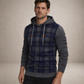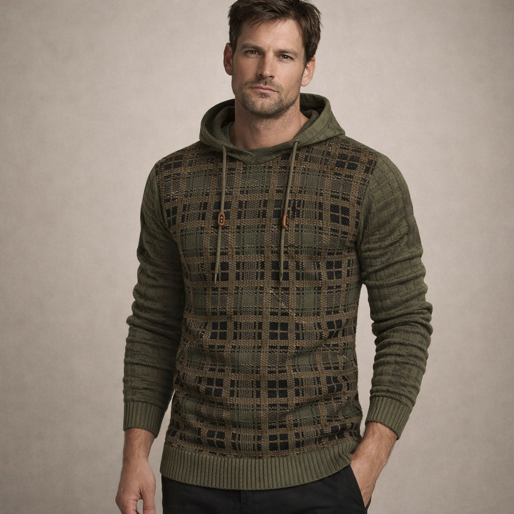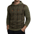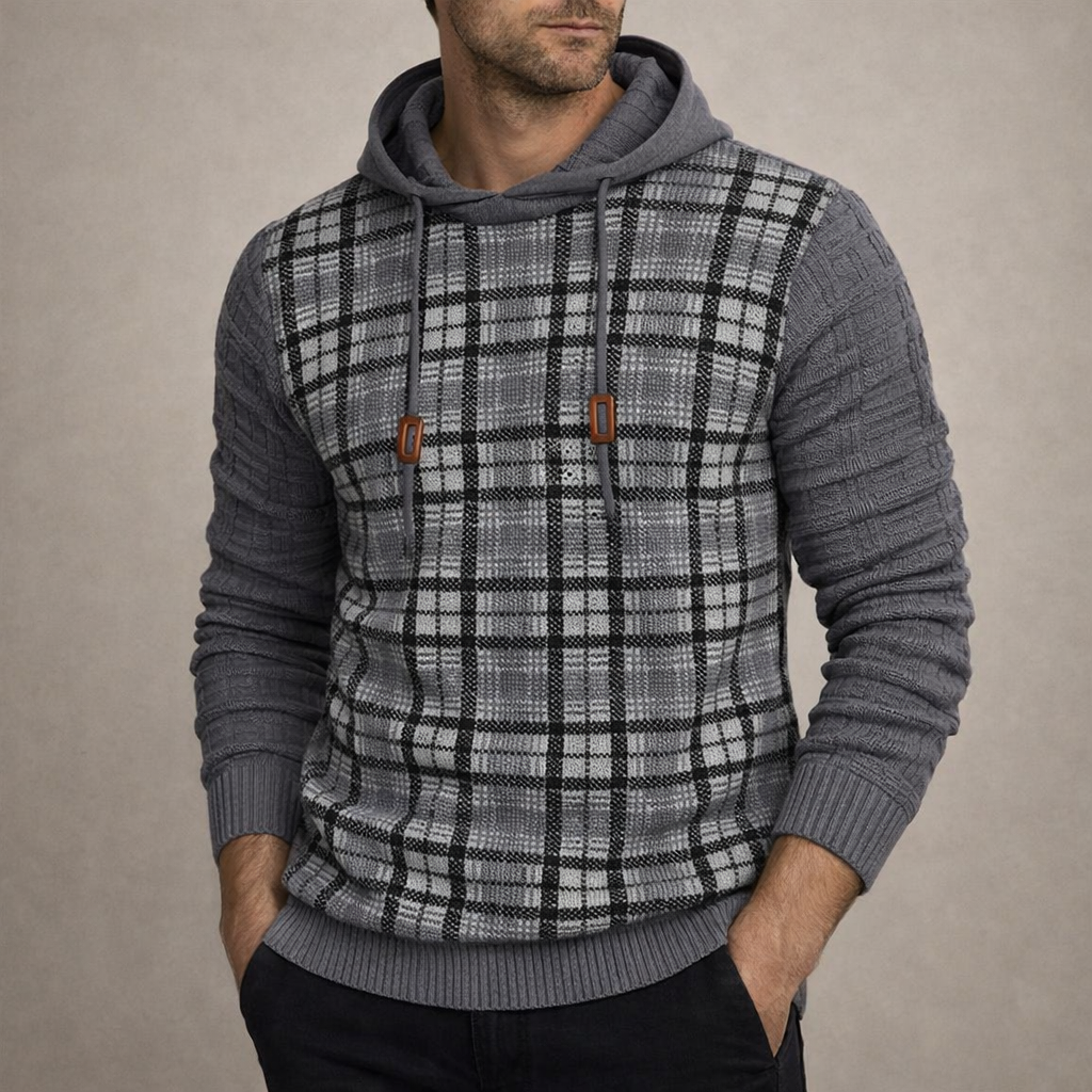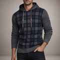 Key features of this Men’s Plaid Knit Hoodie with Drawstring Detail