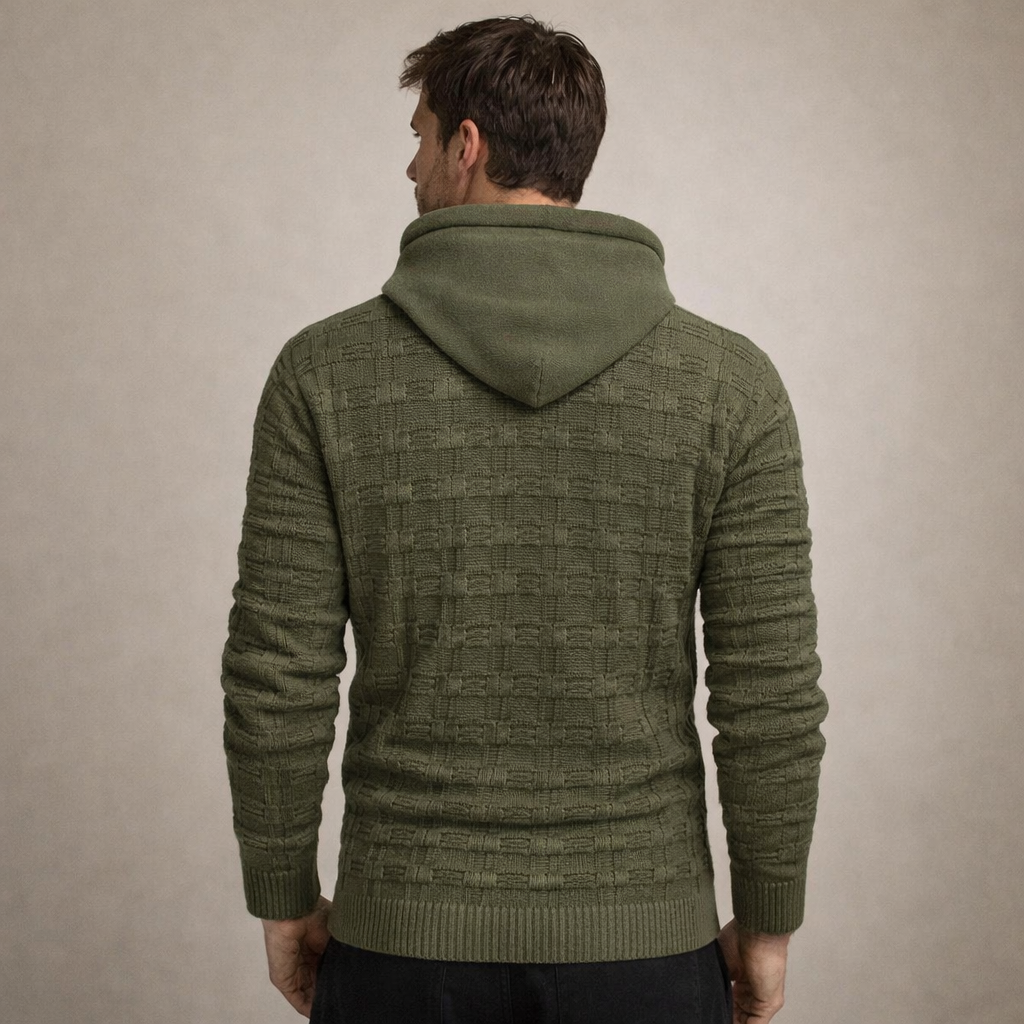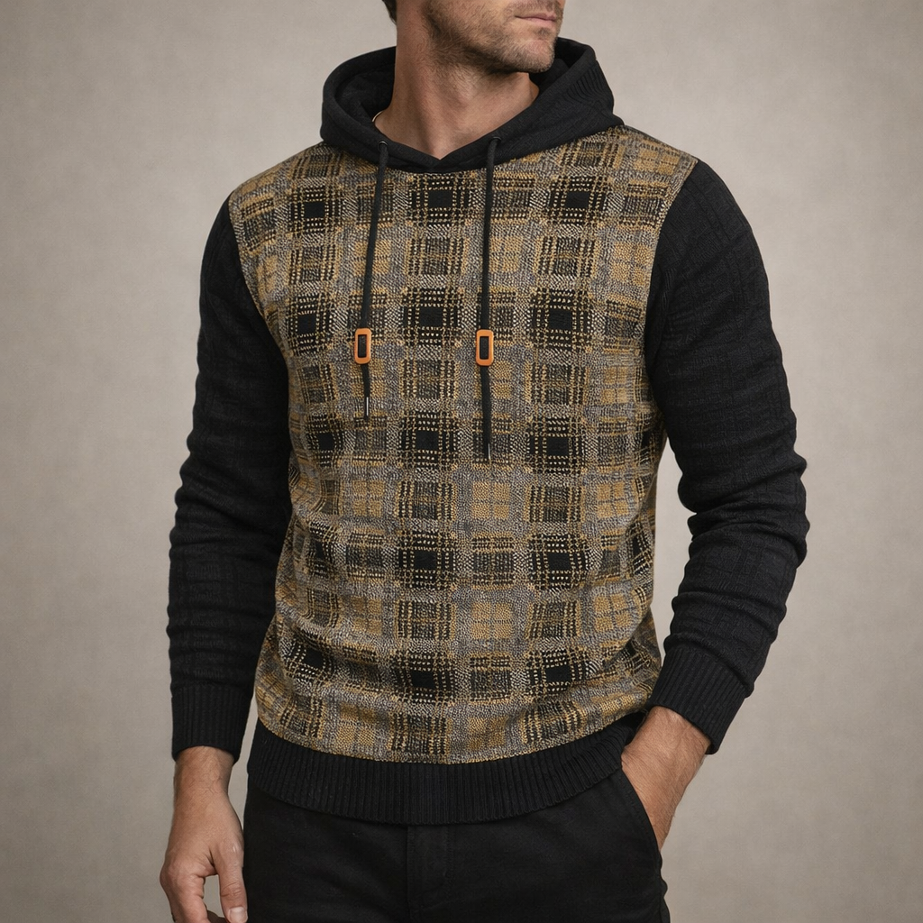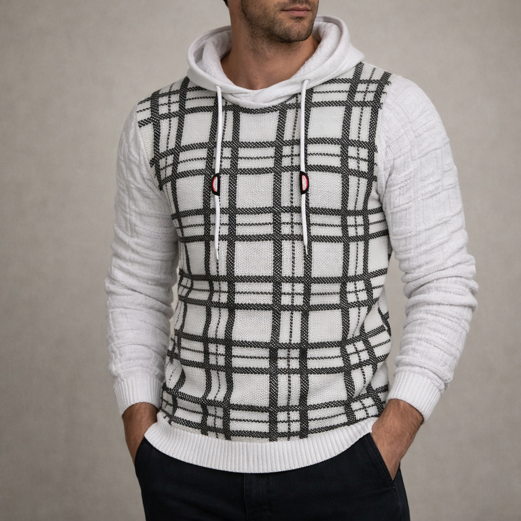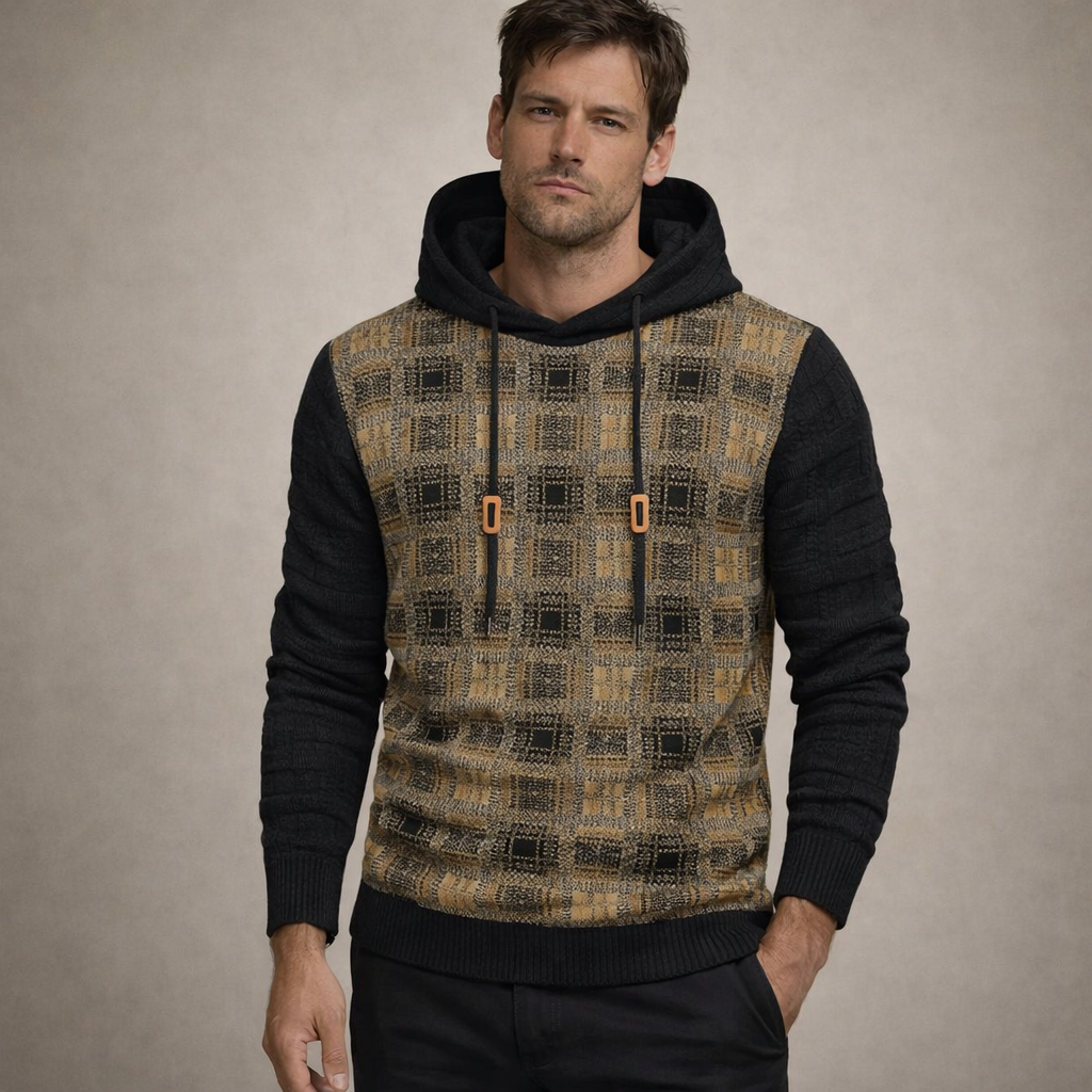 Key features of this Men’s Plaid Knit Hoodie with Drawstring Detail