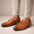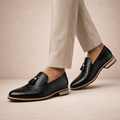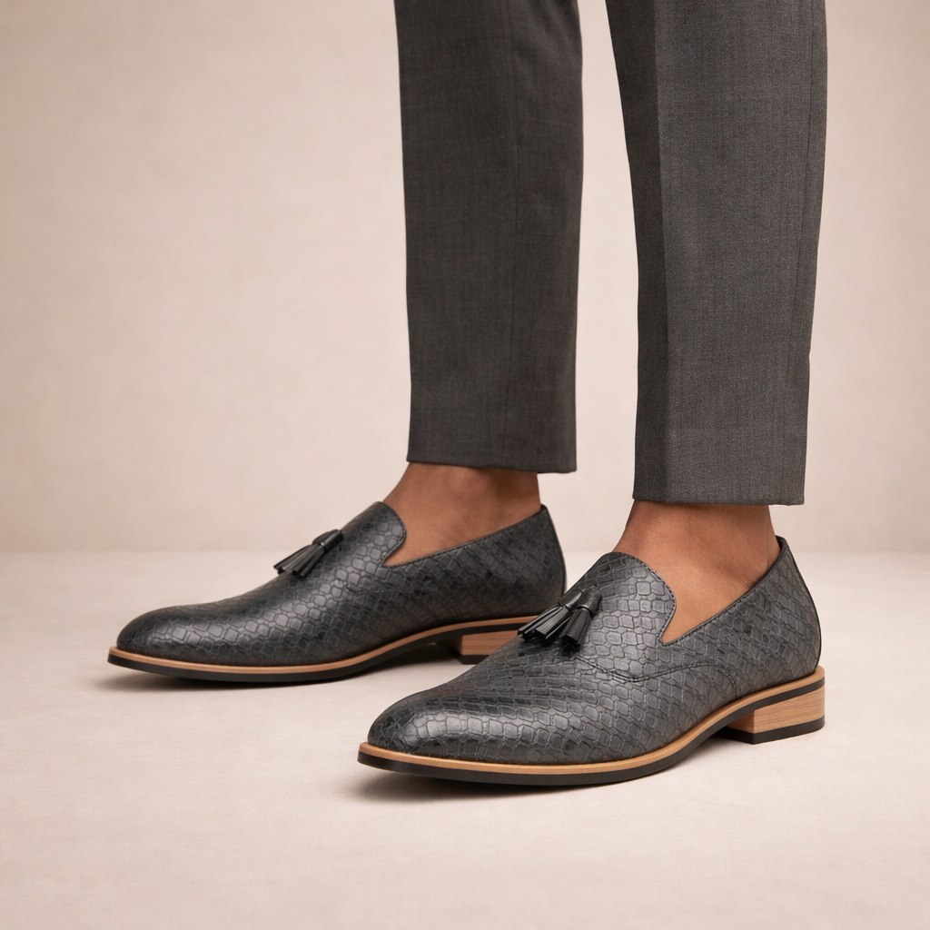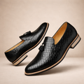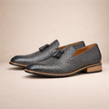 These men’s leather loafers combine classic craftsmanship with a modern woven texture, offering a smart, polished option for formal and business-casual settings. The sleek silhouette and tassel detail elevate everyday dressing with understated sophistication.