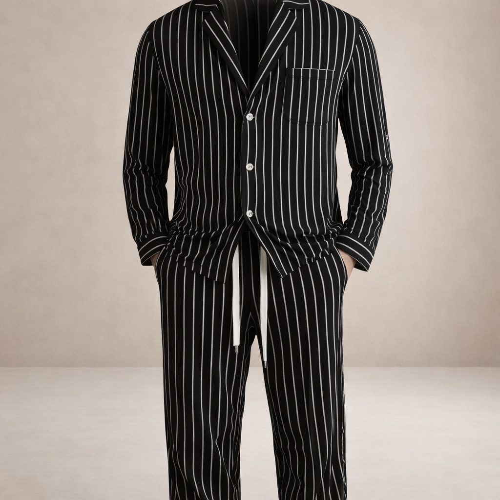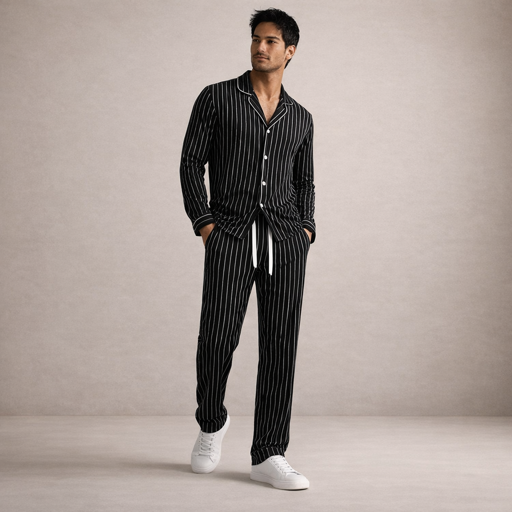 This men’s striped co-ord set delivers a relaxed yet polished look with a modern retro influence. Designed for comfort and ease, it offers a coordinated silhouette that works effortlessly for lounging, travel, or casual everyday wear while maintaining a clean, stylish appearance.