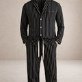 Design: Vertical stripe pattern with a classic button-front shirt and matching drawstring trousers