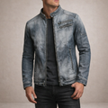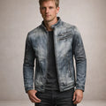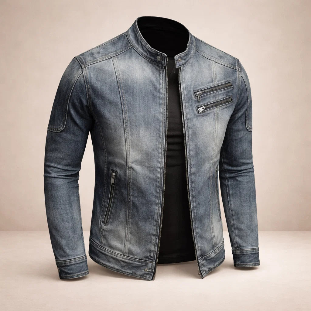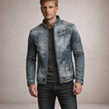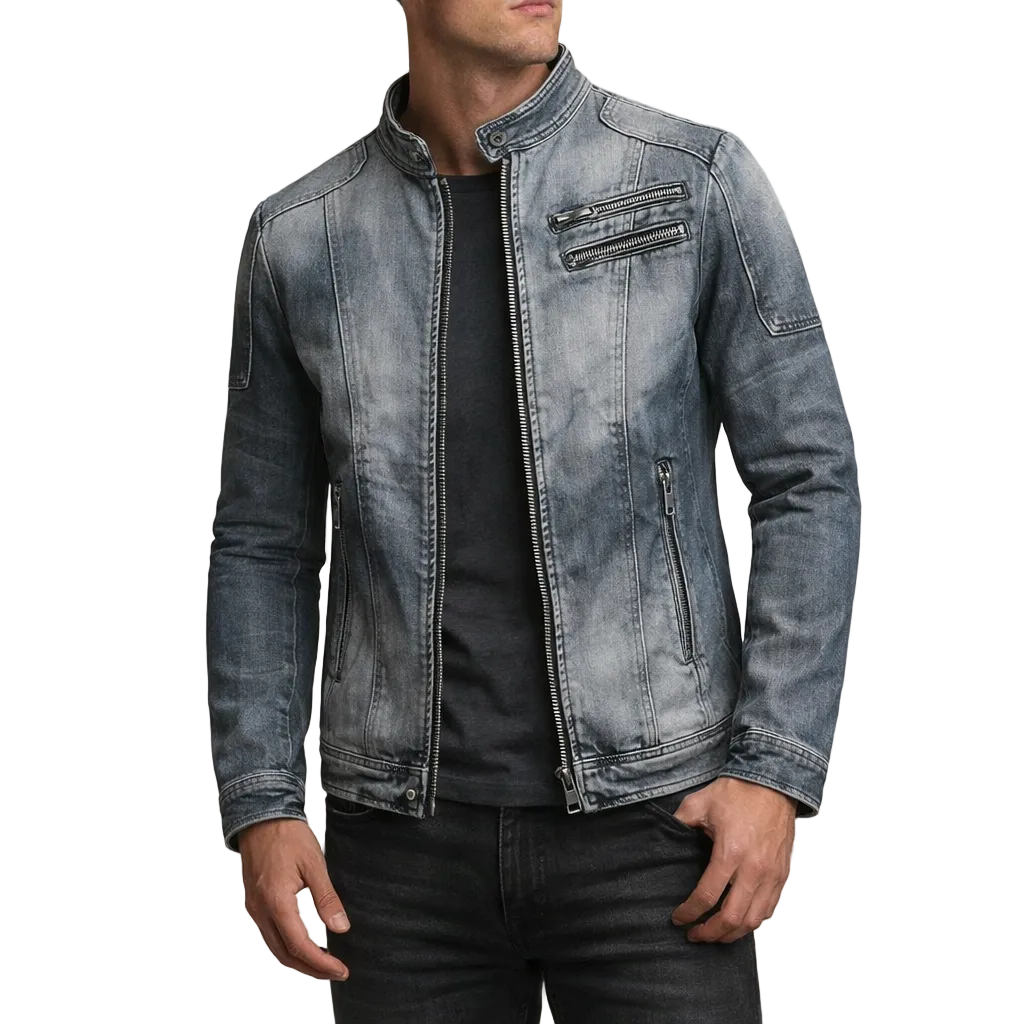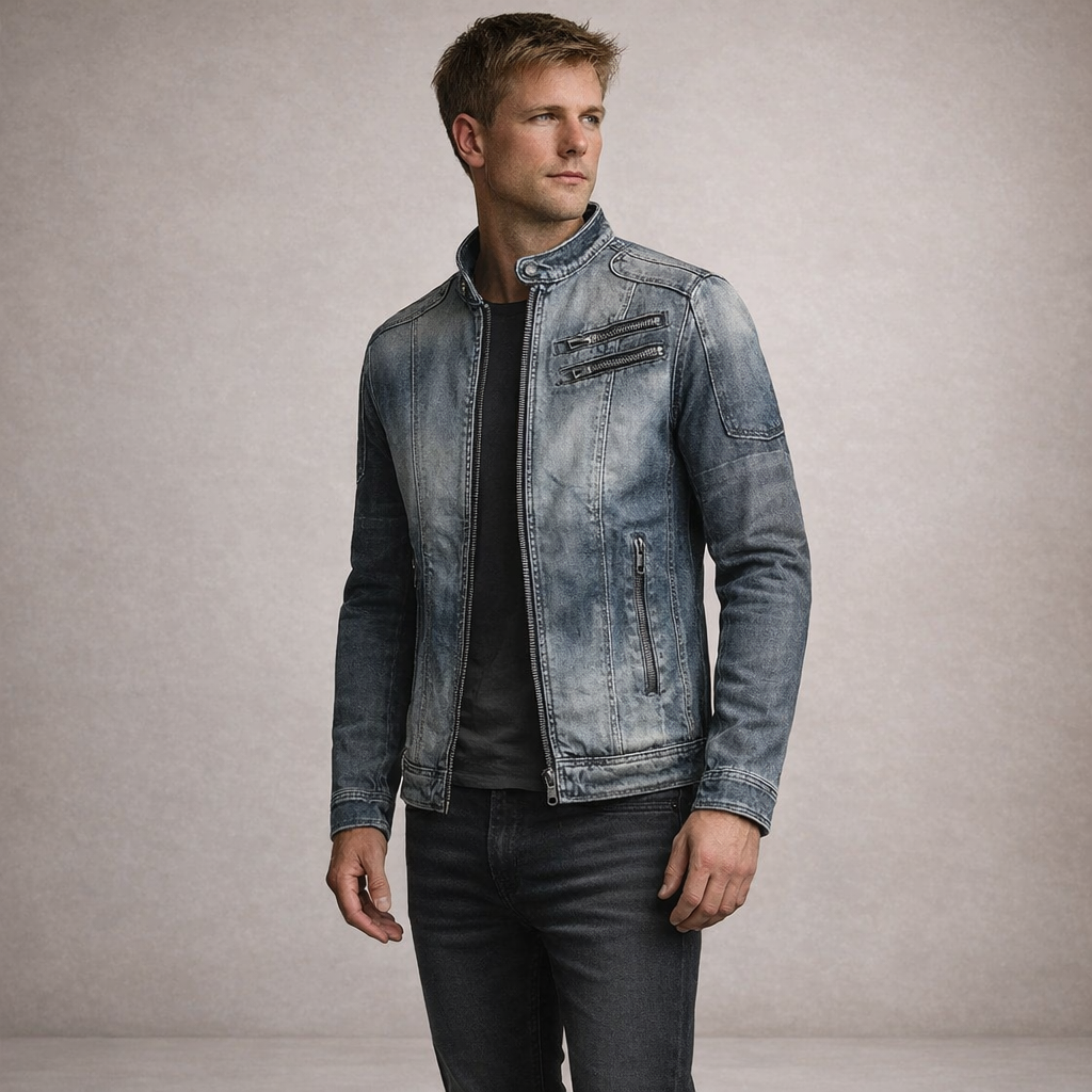 Design: Washed denim finish with a stand collar and streamlined zip-front closure for a modern biker-inspired look