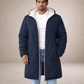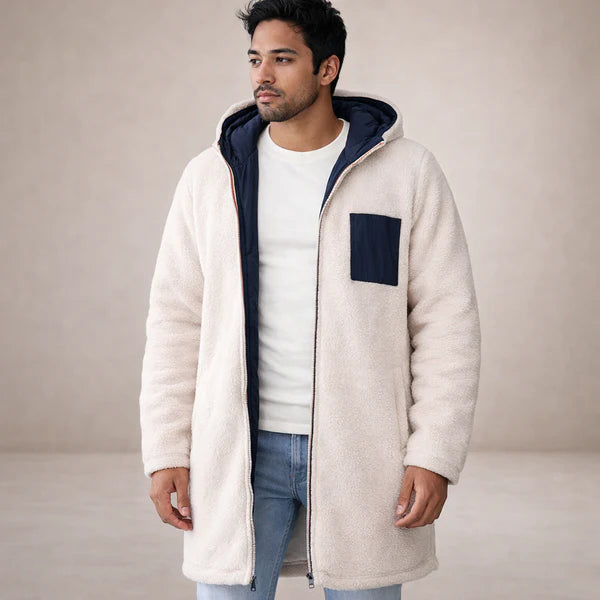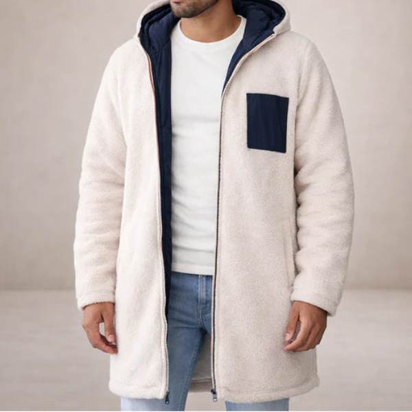This men’s long coat features a reversible design with a teddy fleece outer on one side and a smooth contrasting inner side. The coat has a full-length zip fastening at the front and an attached hood. Long sleeves and a straight hem extending below the hips are visible. A patch chest pocket is positioned on one side of the coat, and side pockets are integrated into the design.