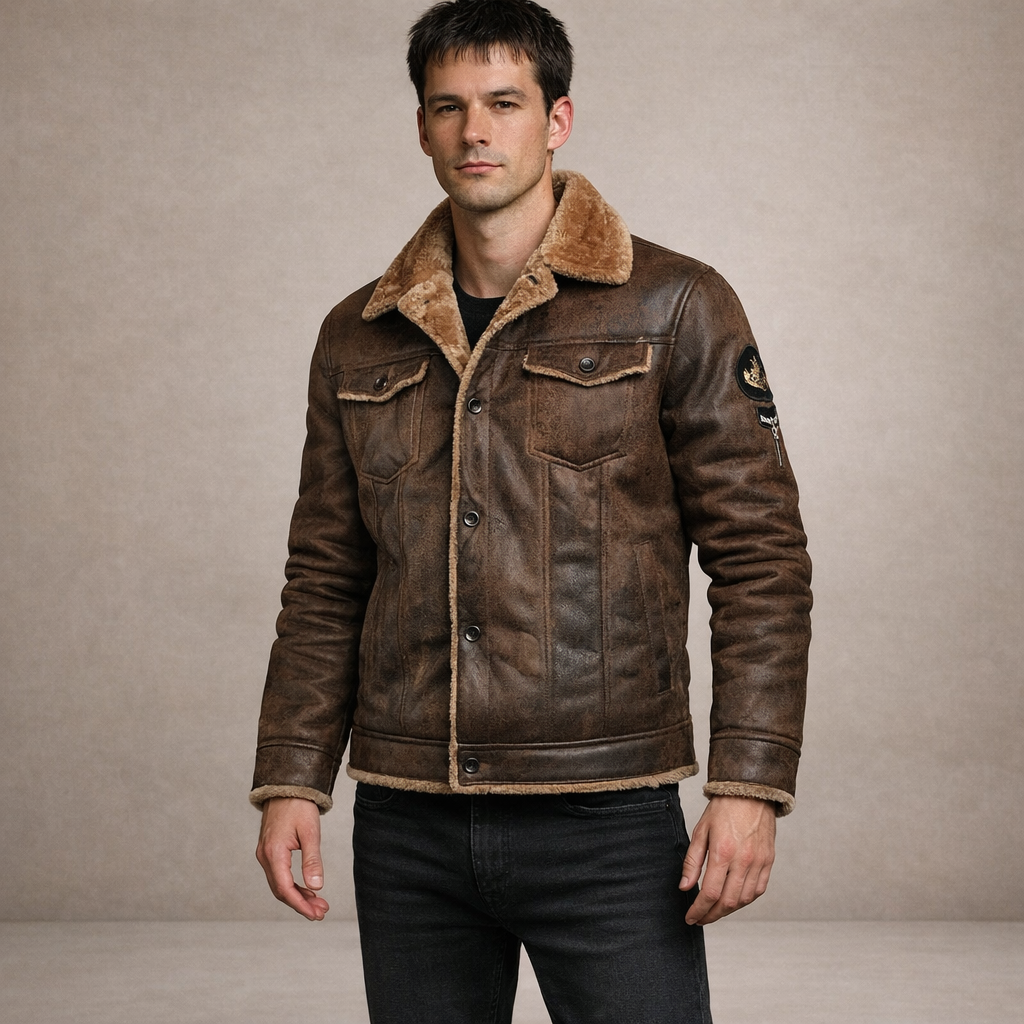 Rugged charm meets dependable warmth in this men’s brown leather jacket, designed for crisp days and effortless layering. The rich, weathered finish is complemented by a soft shearling-style collar and lining, creating a balanced look that feels both robust and refined. Ideal for weekend wear or casual evenings out, it pairs seamlessly with denim and boots.