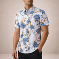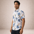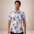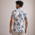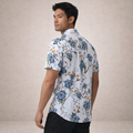 Design: Classic button-through silhouette featuring an all-over blue floral pattern with subtle contrasting accents