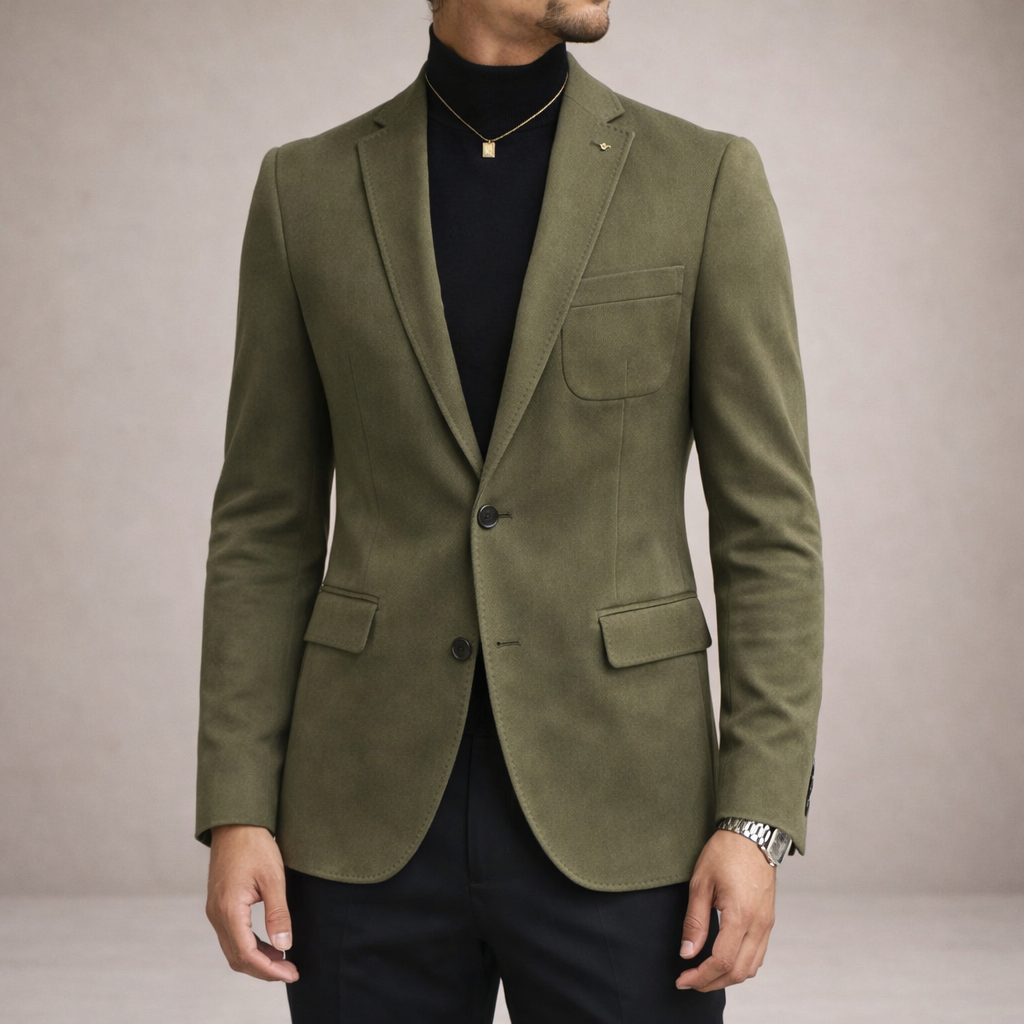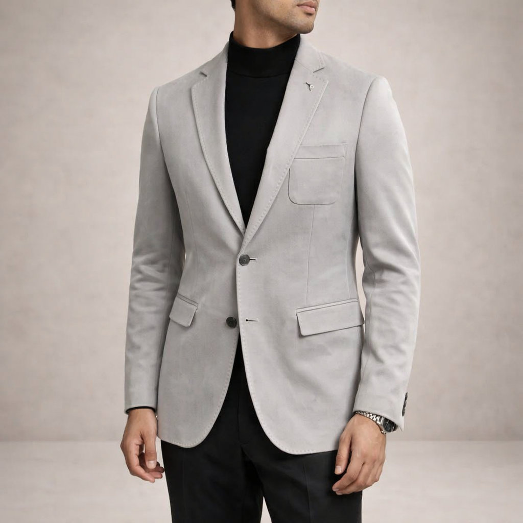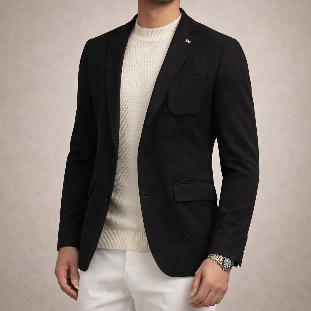 Design: Classic single-breasted blazer with structured lapels and a streamlined, minimalist finish
