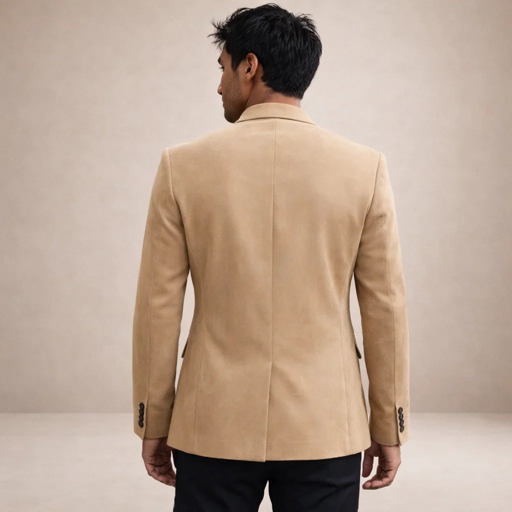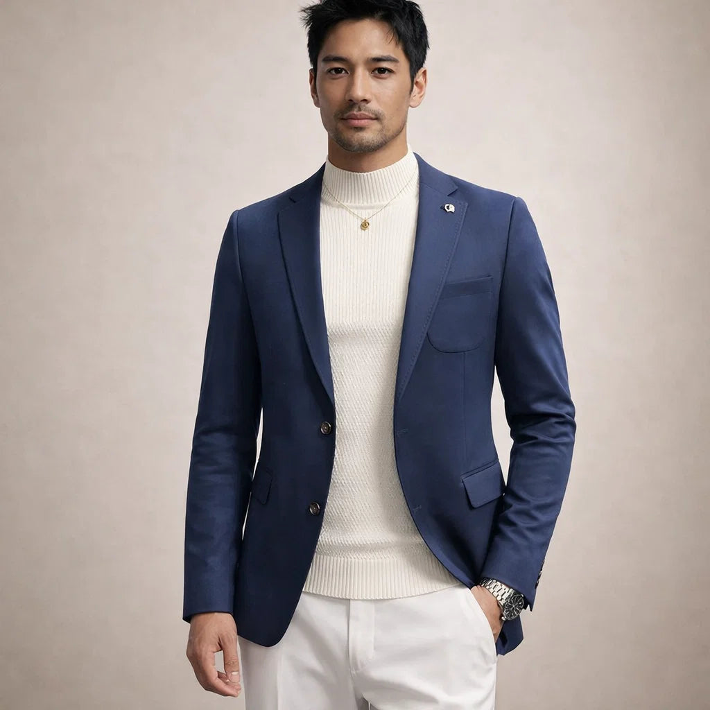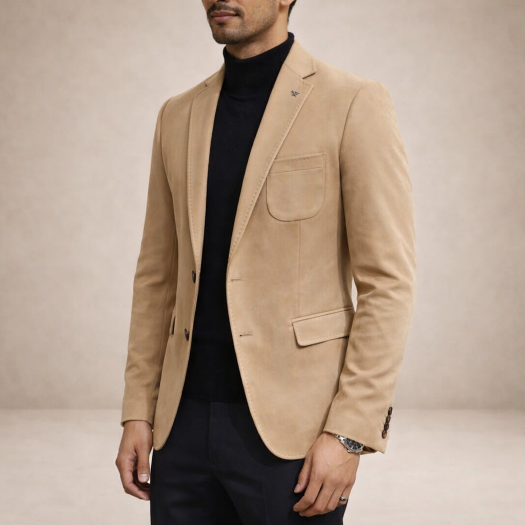 Design: Classic single-breasted blazer with structured lapels and a streamlined, minimalist finish