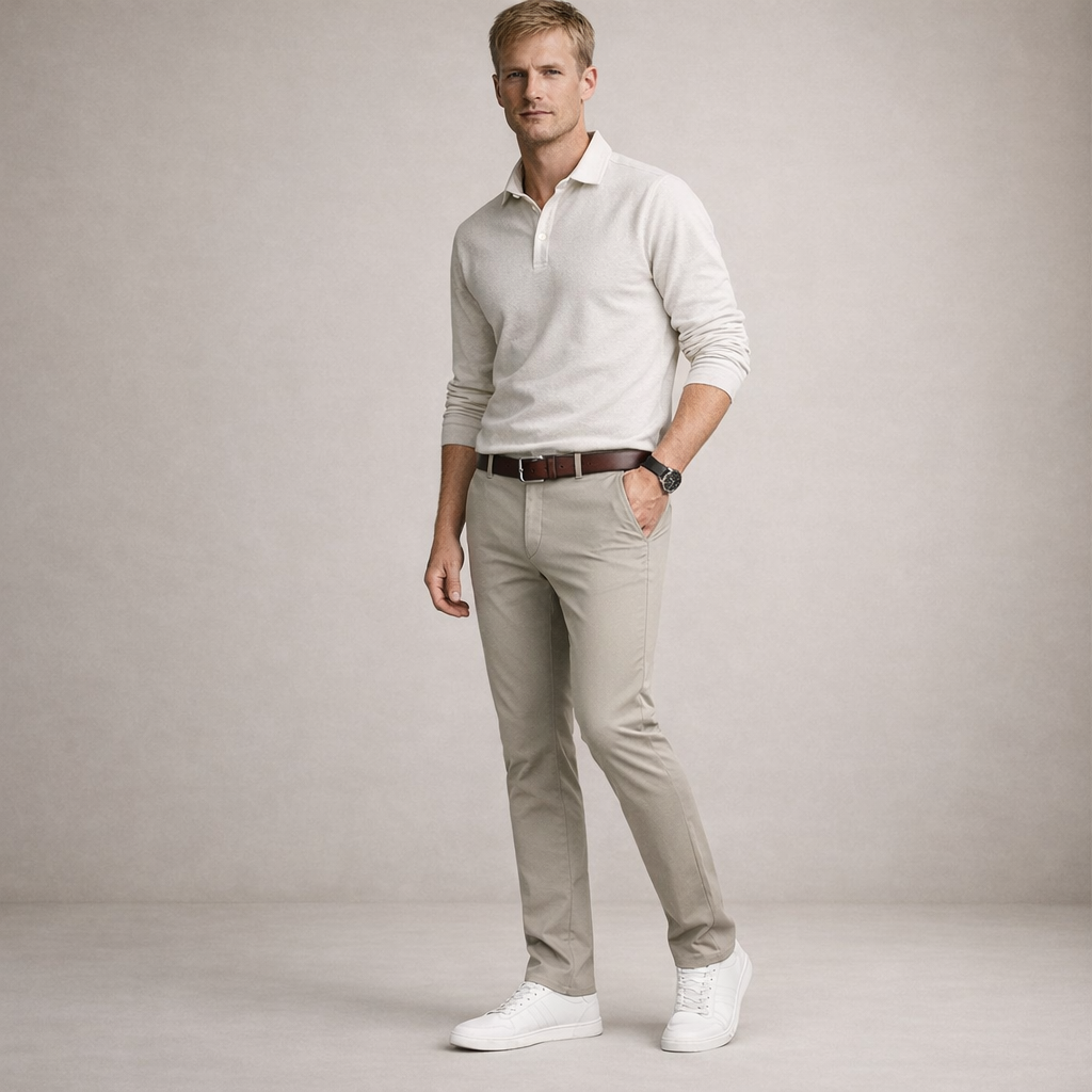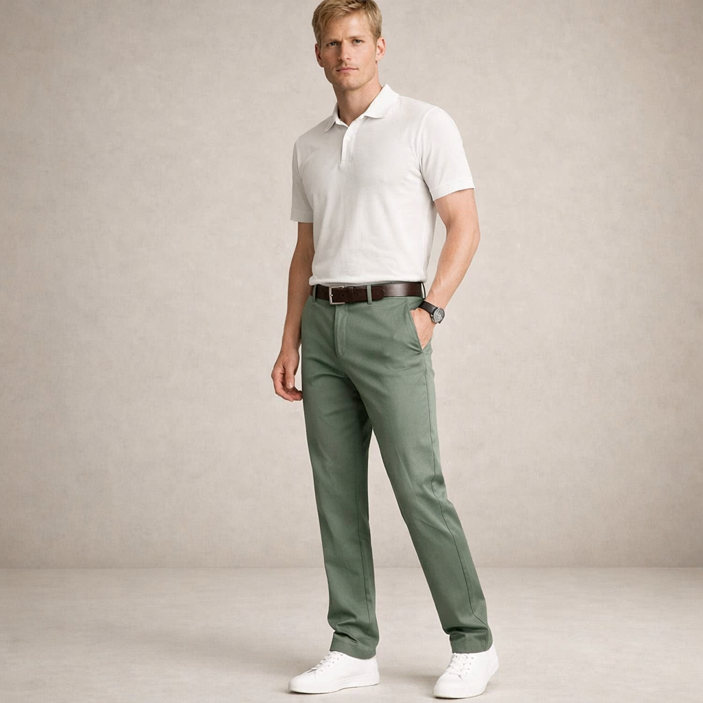 Design: Streamlined chino silhouette with a flat front and classic waistband for a sharp, timeless appearance