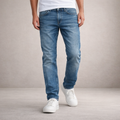 These men’s slim fit denim jeans are designed for everyday comfort with a modern, streamlined look. Made from stretch denim, they offer flexibility and ease of movement while maintaining a clean, tailored silhouette. The classic blue wash makes them easy to pair with casual and smart-casual outfits alike.