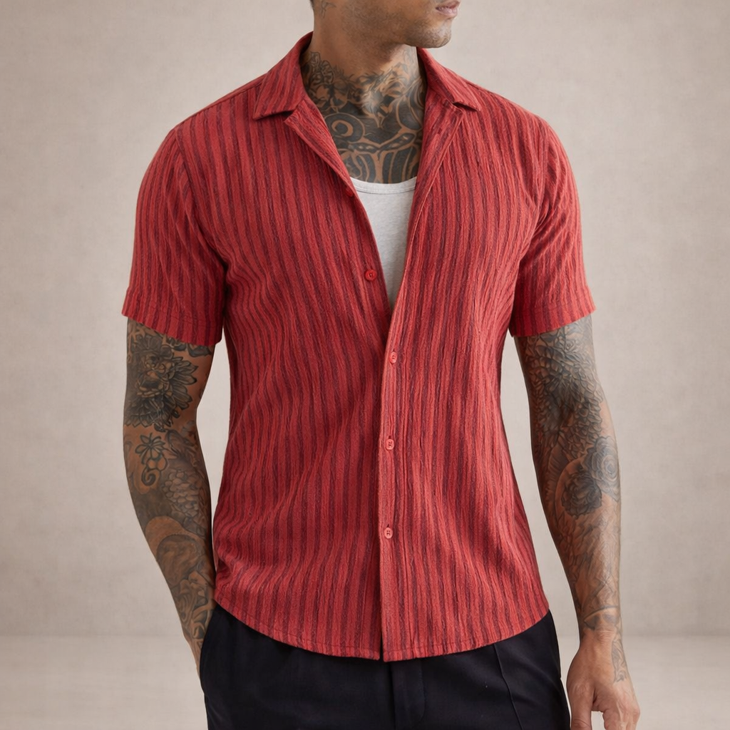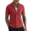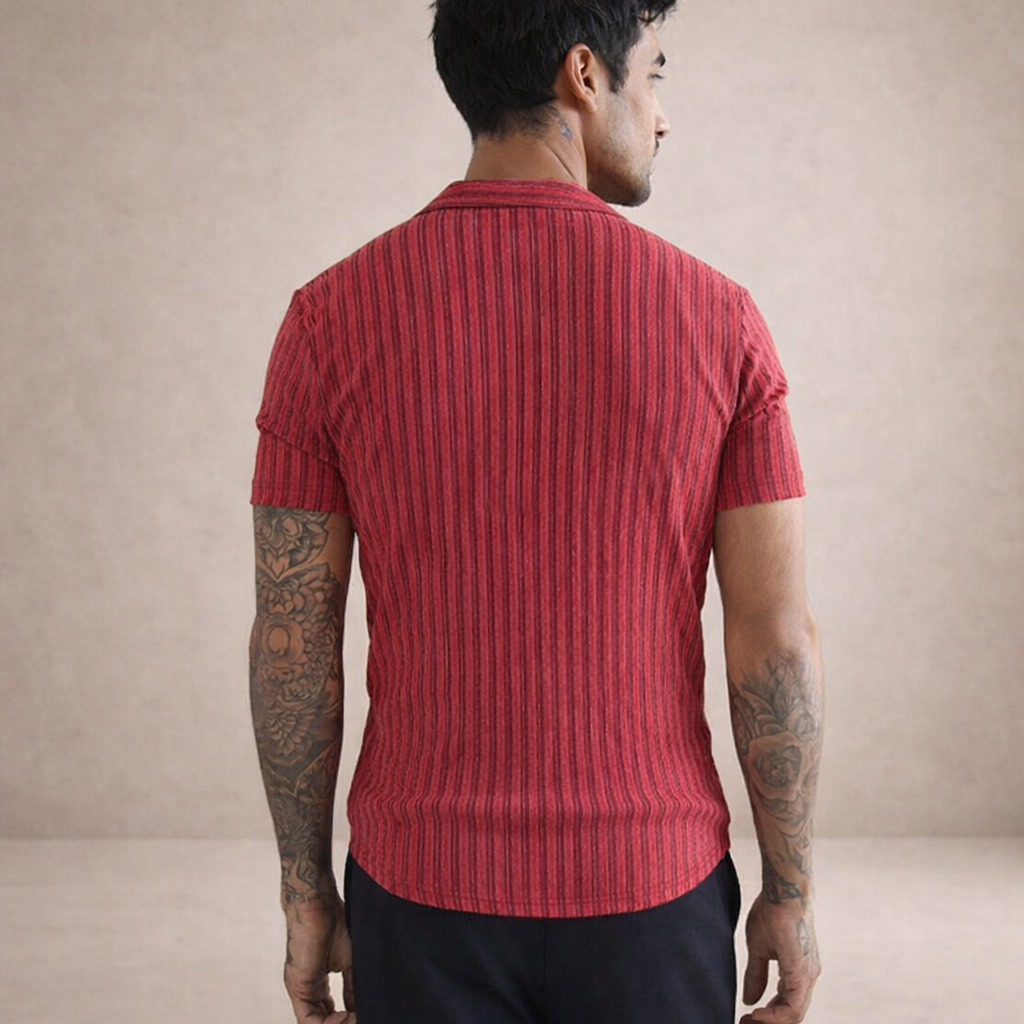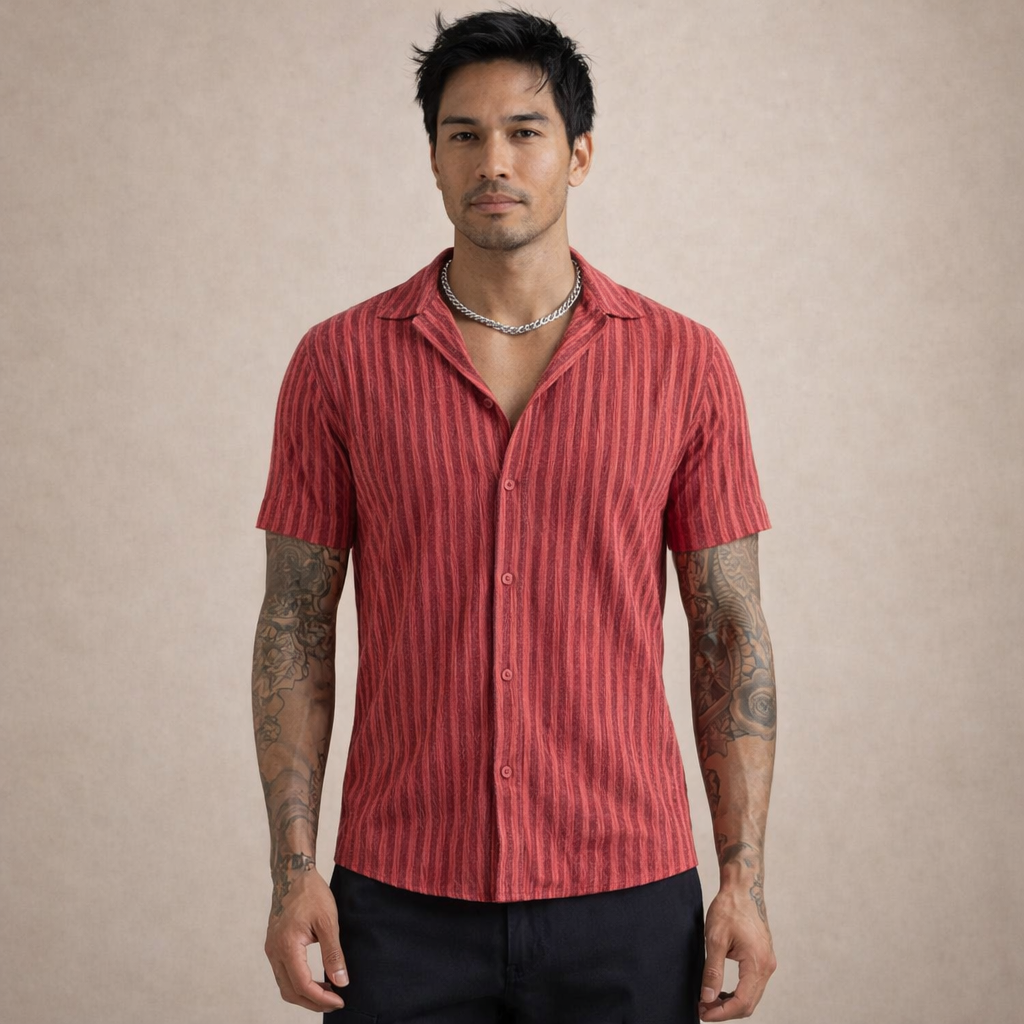 Confident and contemporary, this Men’s Slim Fit Short Sleeve Textured Red Shirt delivers a sharp silhouette with a distinctive edge. The rich red tone combined with subtle vertical texture creates depth and character, making it ideal for warm evenings, social occasions or elevated everyday wear. Worn open over a vest or buttoned up with tailored trousers, it offers effortless versatility.