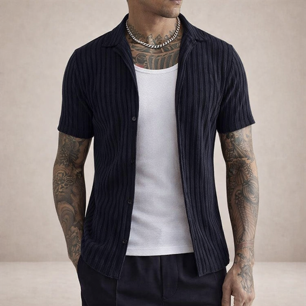 Design: Vertical textured pattern with a refined open collar for a modern, streamlined appearance