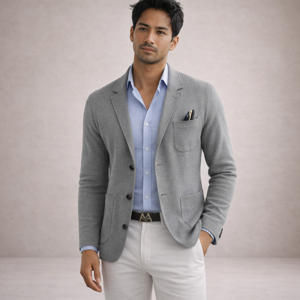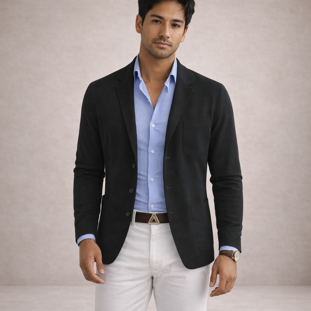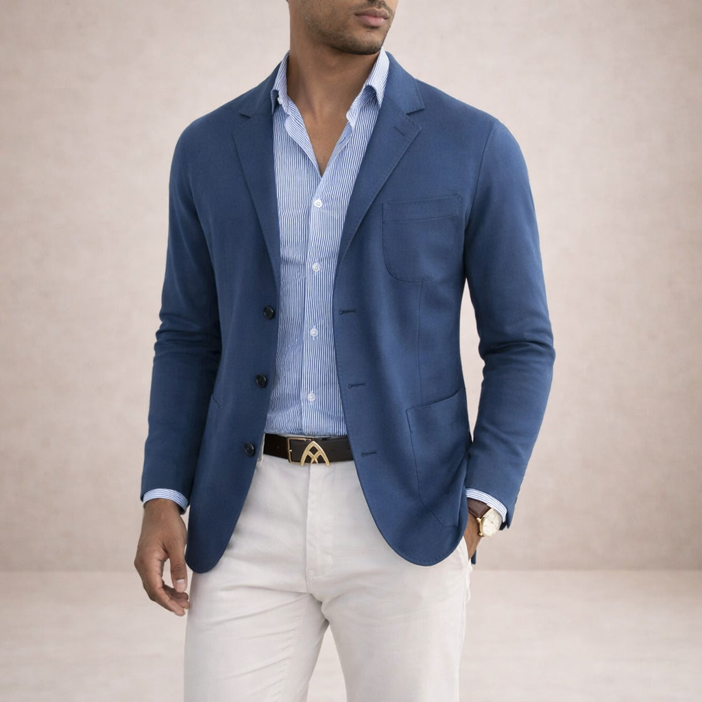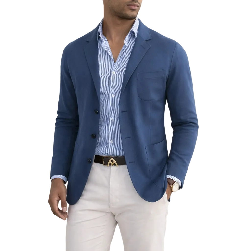 Design: Classic notch lapel blazer in a deep blue tone, paired with a striped shirt and light trousers for a modern contrast.