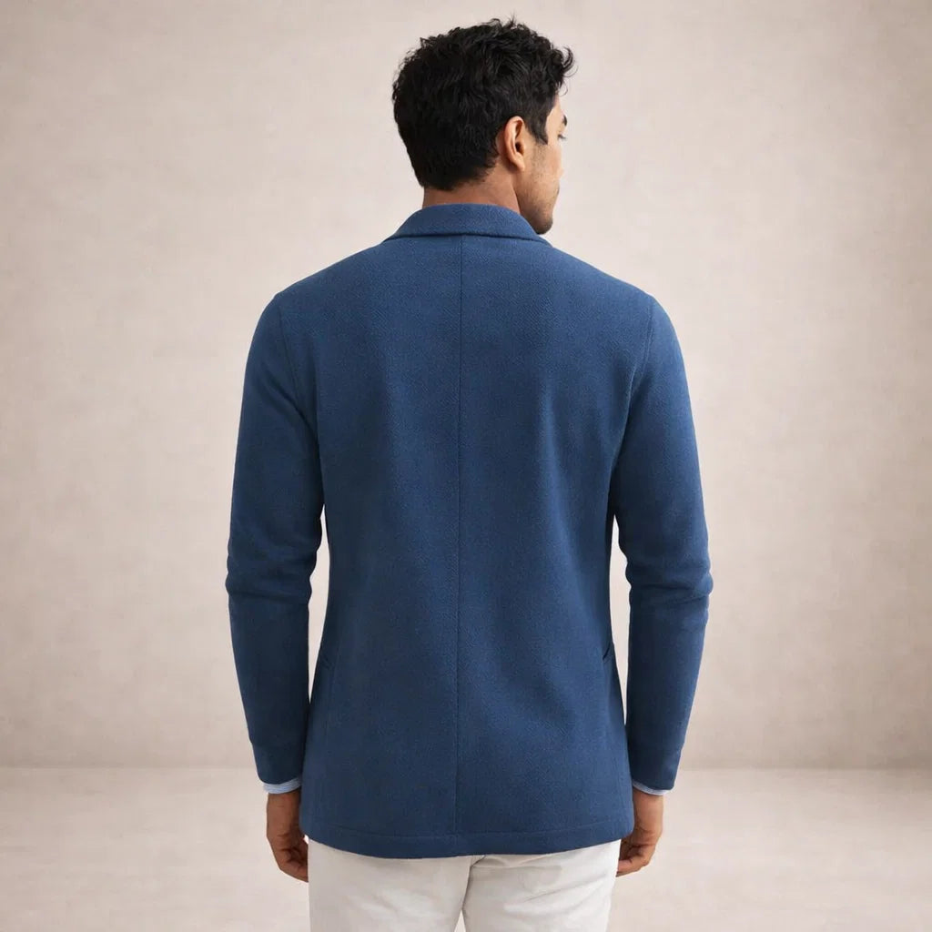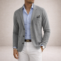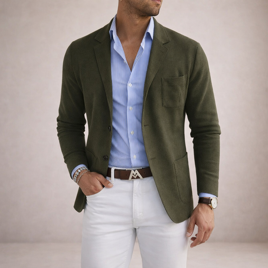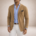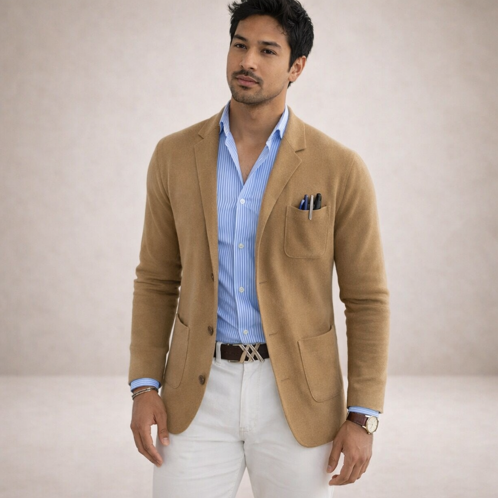 Design: Classic notch lapel blazer in a deep blue tone, paired with a striped shirt and light trousers for a modern contrast.