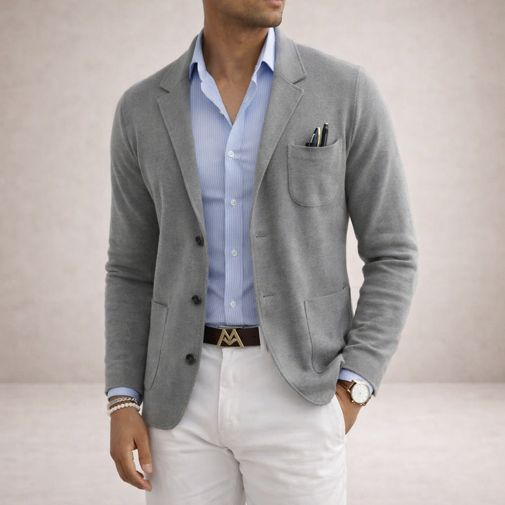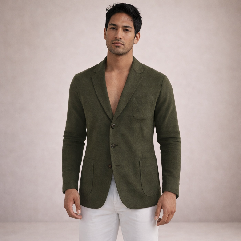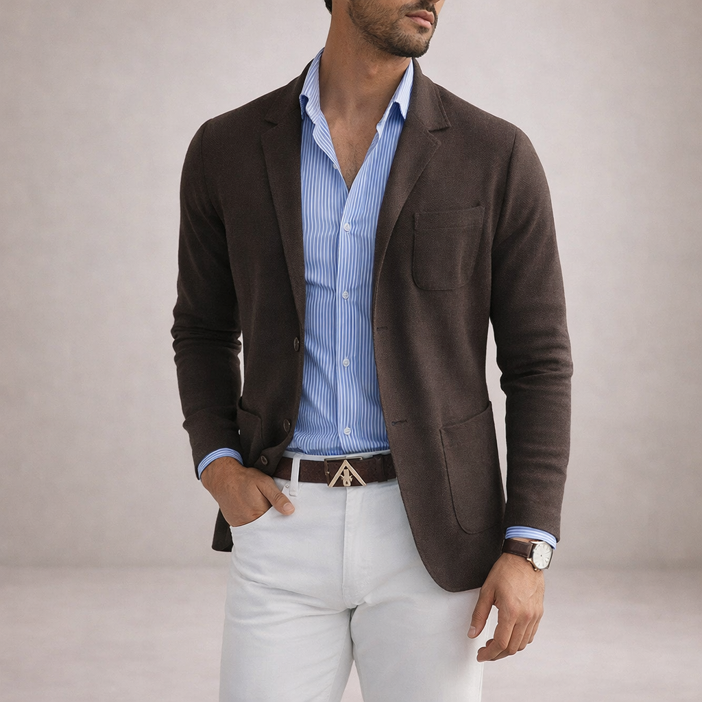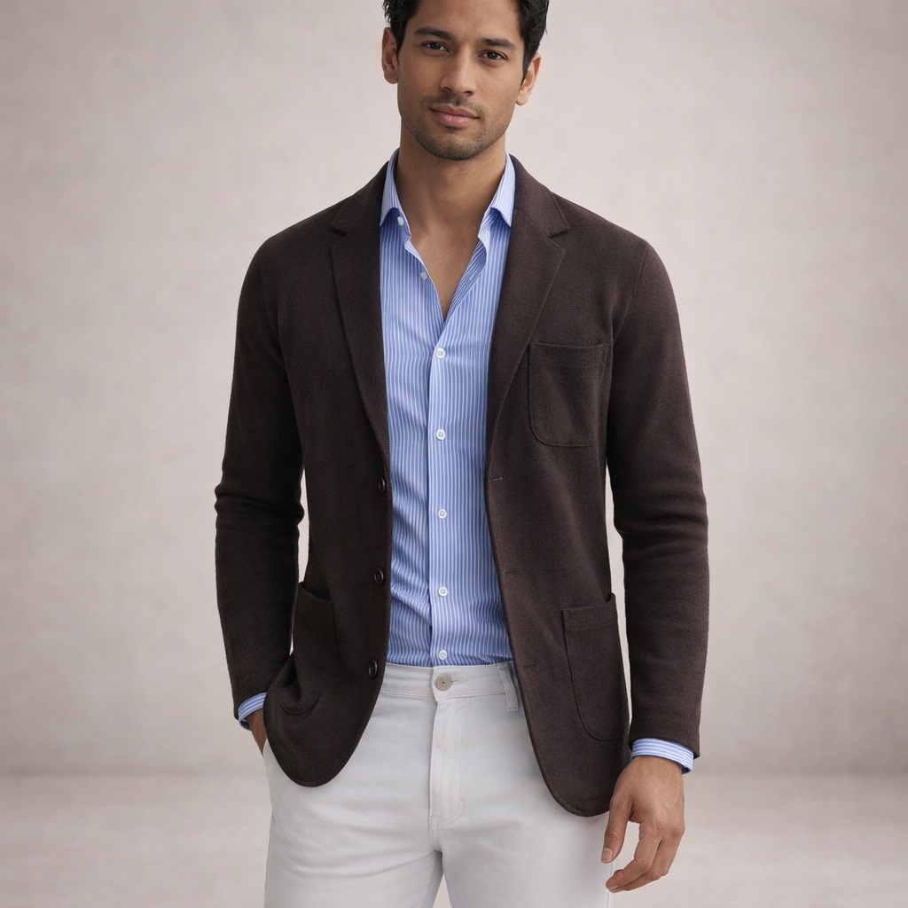 This refined blazer ensemble offers a polished take on smart-casual dressing, perfect for business meetings, evening gatherings or semi-formal occasions. The combination of tailored structure with relaxed styling creates a versatile look that balances sophistication with ease.