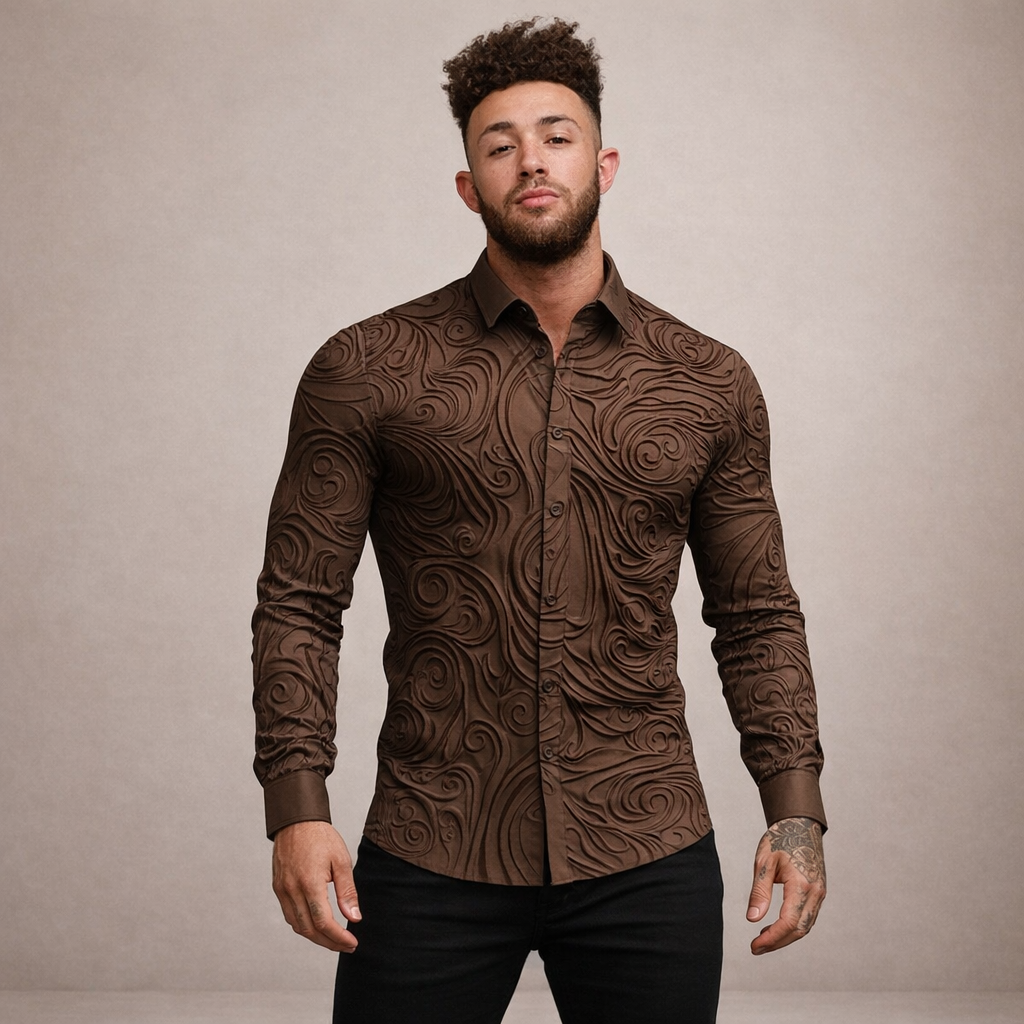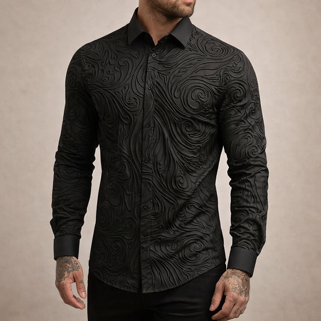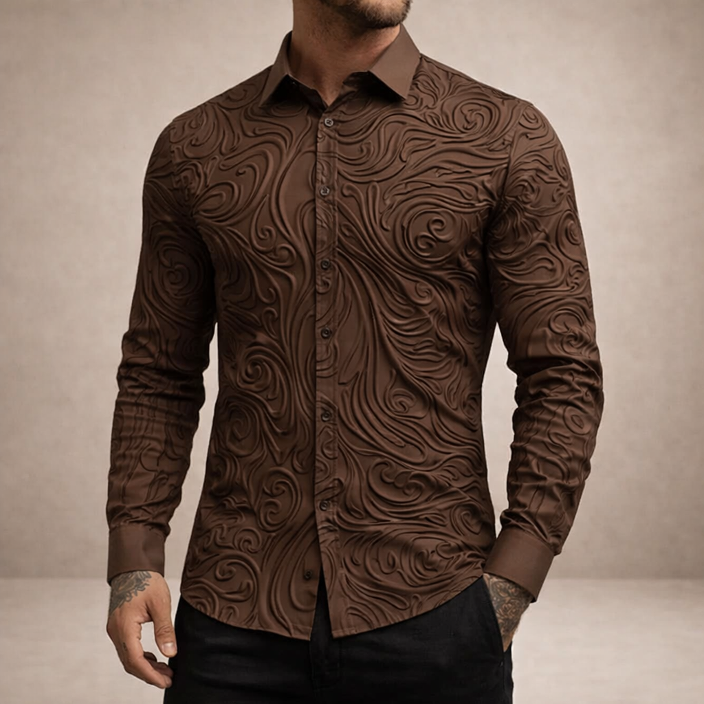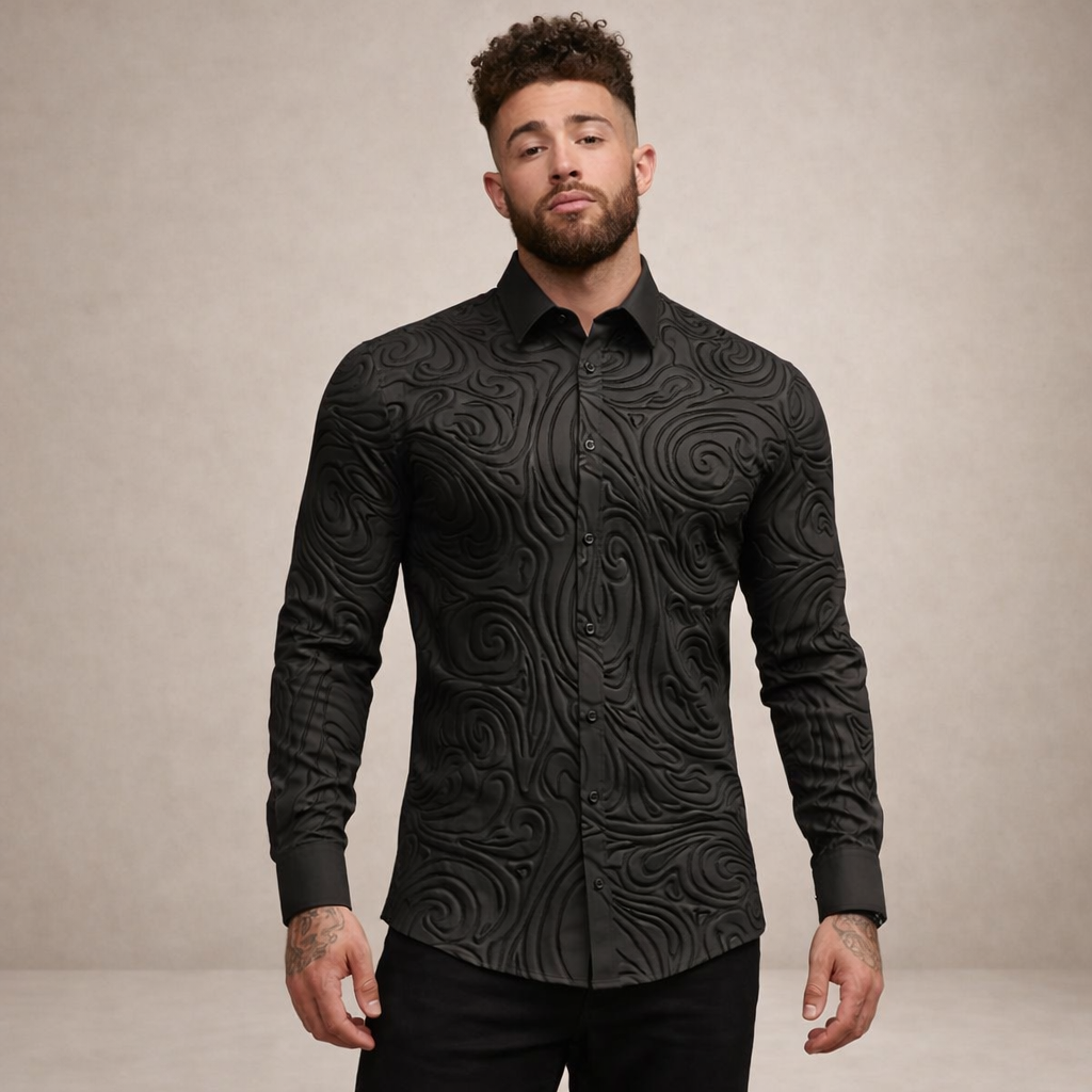 Design: Intricate embossed-style swirl pattern across the fabric creates texture and visual depth, complemented by a sharp classic collar and clean button-front fastening.