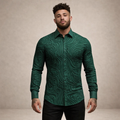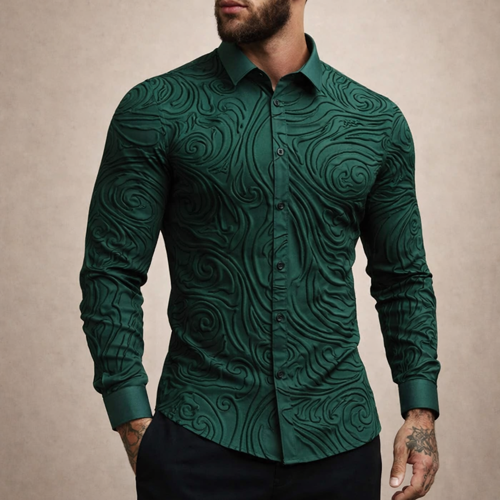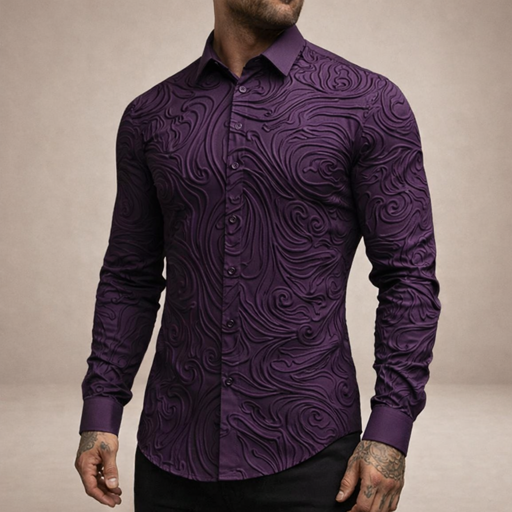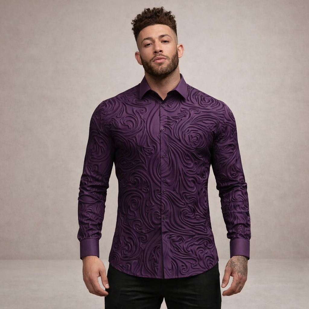 Design: Intricate embossed-style swirl pattern across the fabric creates texture and visual depth, complemented by a sharp classic collar and clean button-front fastening.