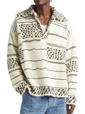 This men’s long-sleeve sweater features a collar with a V-neck opening. The edges of the collar, hem, and cuffs display a textured trim. The sweater includes horizontal stripe patterns across the body and sleeves. Rectangular panels with a speckled pattern are also incorporated into the sweater.