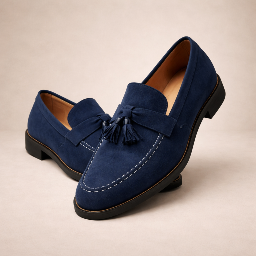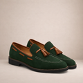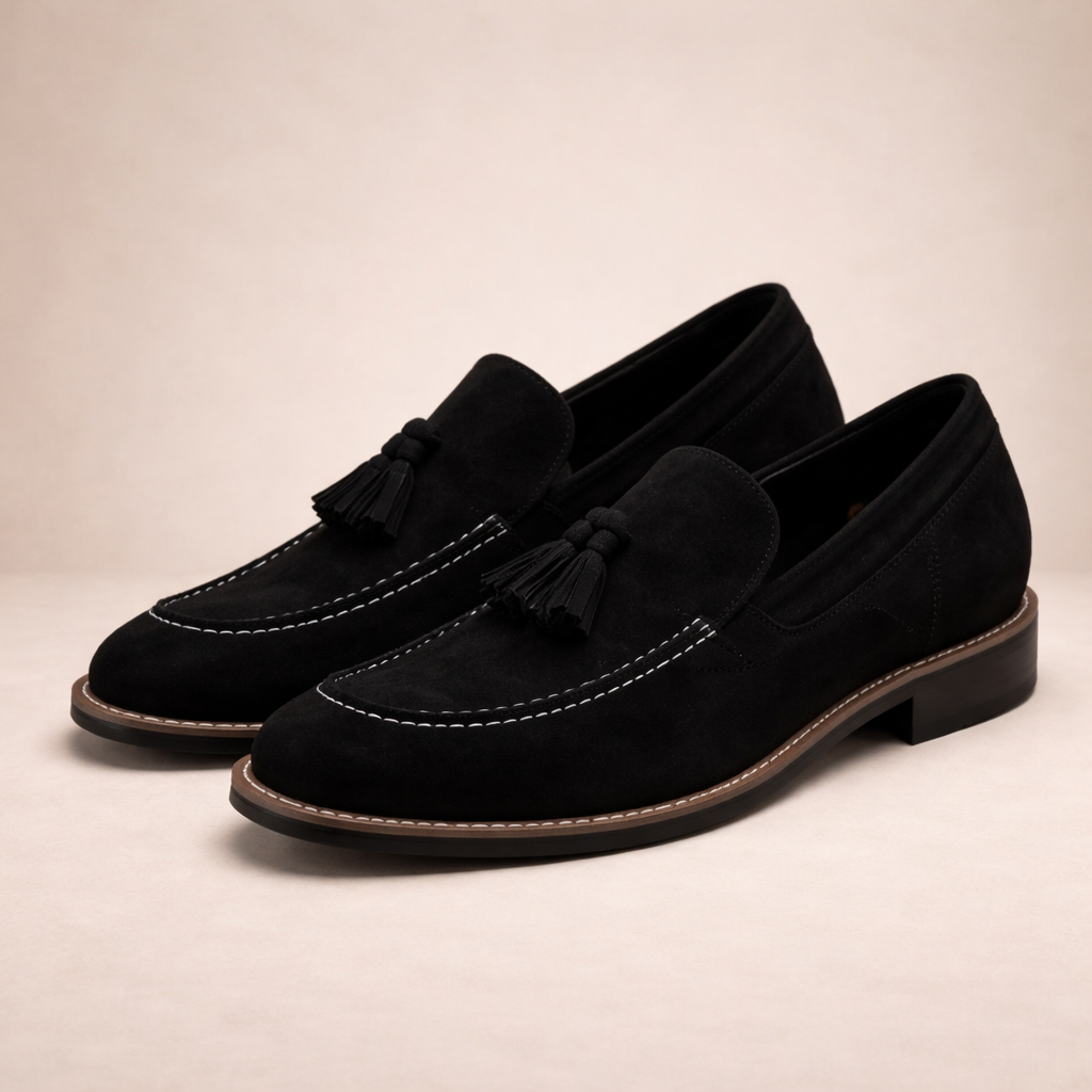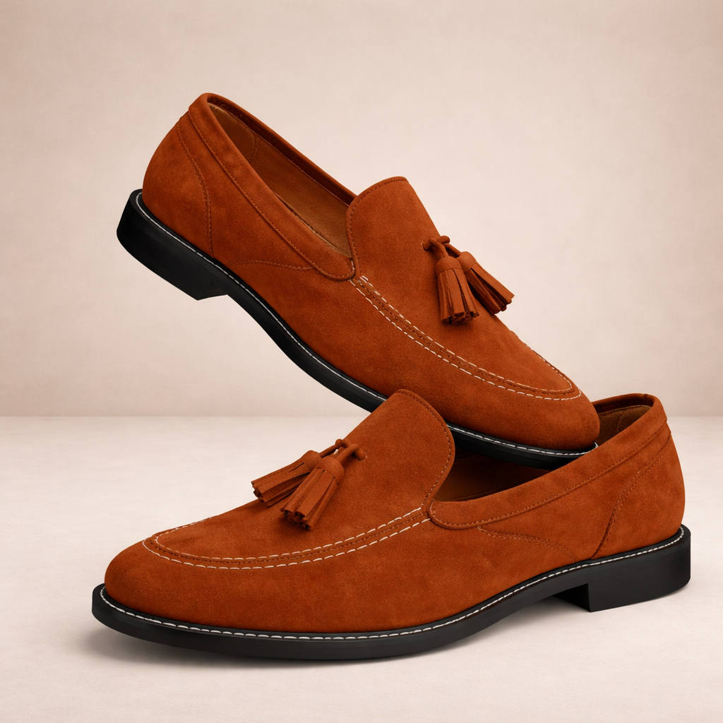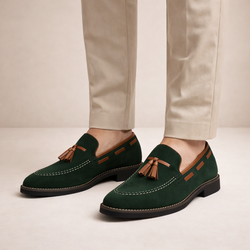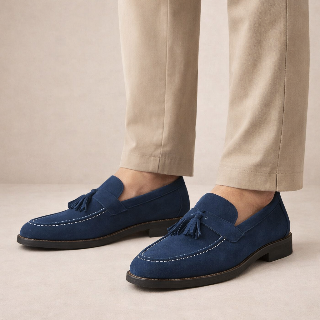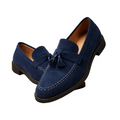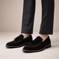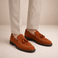These men’s loafers feature a slip-on design with a low-profile silhouette. The upper is made from suede-look material with a smooth, matte texture. Tassel detailing is positioned on the front of the shoe, with visible stitching around the toe area. The loafers have a closed toe design and a low heel with a flat sole.